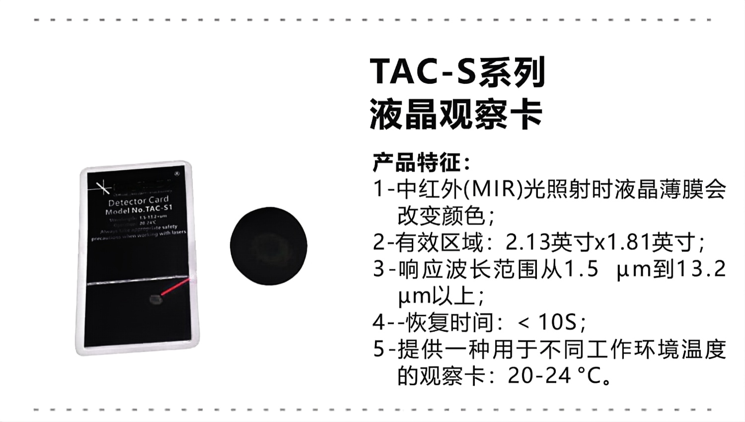 1-中红外(MIR)光照射时液晶薄膜会改变颜色; 2-有效区域:2.13英寸x1.81英寸;3-响应波长范围从1.5 um到13.2 um以上: 4--恢复时间:<10S: 5-提供一种用于不同工作环境温度的观察卡:20-24°C