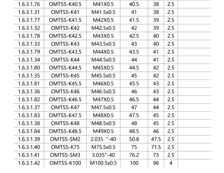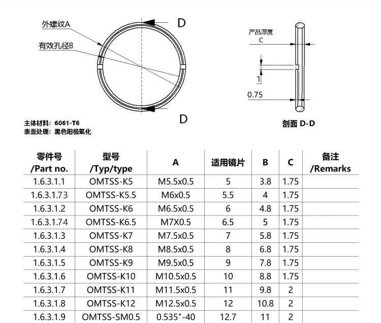 1-整体铝合金材料表面黑色阳极氧化;2-美制型号,比如SM1\SM05等,均兼容进口产品; 3-公制螺纹,螺距都为0.5mm;4-因为产品型号太多,无法全部单独列出,所以需要和客服沟通后拍下备注 需要型号 5-所有螺纹基本都有现货,具体咨询即 可。