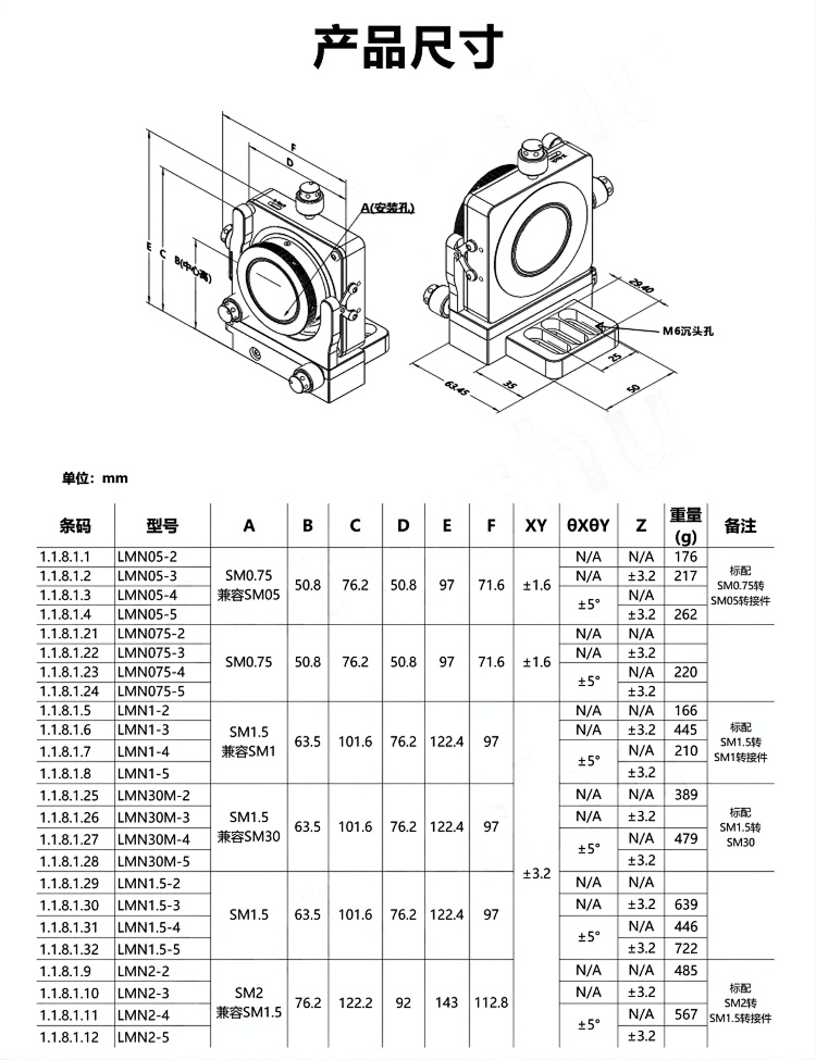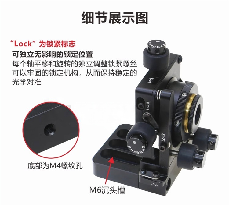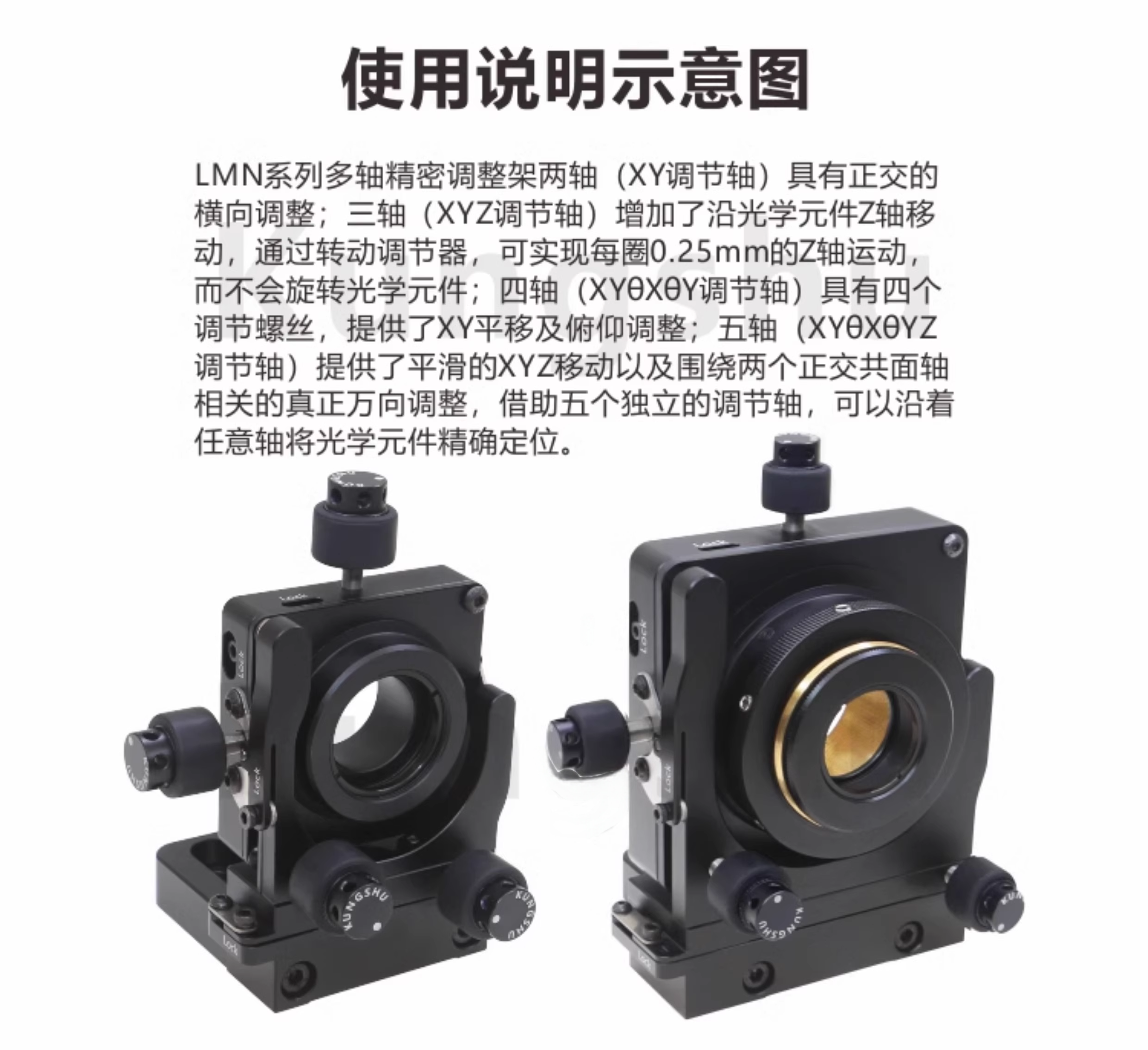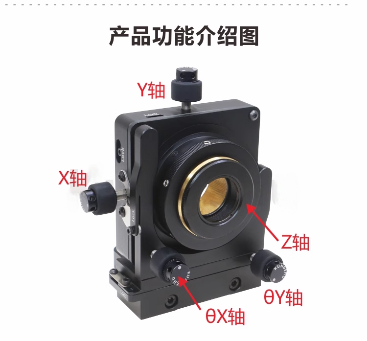 LMN系列多轴精密调整架两轴(XY调节轴)具有正交的 横向调整;三轴(XYZ调节轴)增加了沿光学元件Z轴移 动,通过转动调节器,可实现每圈0.25mm的Z轴运动, 而不会旋转光学元件;四轴(XYθXθY调节轴)具有四个 调节螺丝,提供了XY平移及俯仰调整;五轴(XYθXθYZ 调节轴)提供了平滑的XYZ移动以及围绕两个正交共面轴 相关的真正万向调整,借助五个独立的调节轴,可以沿着 任意轴将光学元件精确定位。 整体为铝合金材质制造。表面黑色阳极氧化处理。XY、XYZ、XYθXθY、XYθXθYZ四种调节轴可选。万向角度调节。精密调节器螺丝使平滑调节与灵敏度增加。零间隙XY机构可确保精确定位和增强长期稳定性