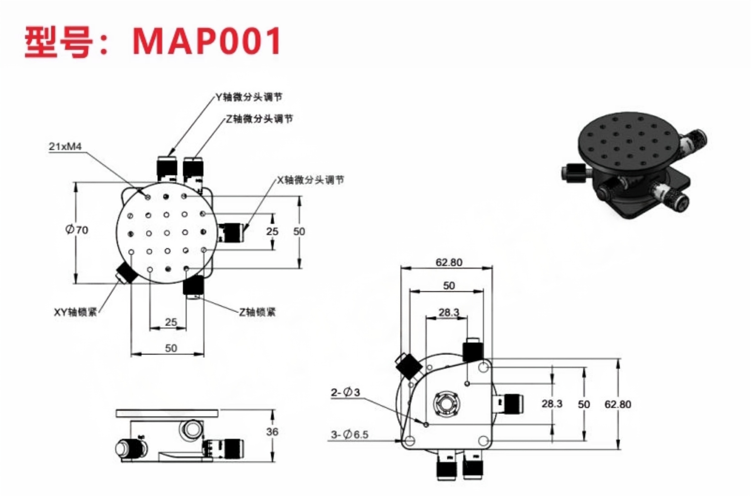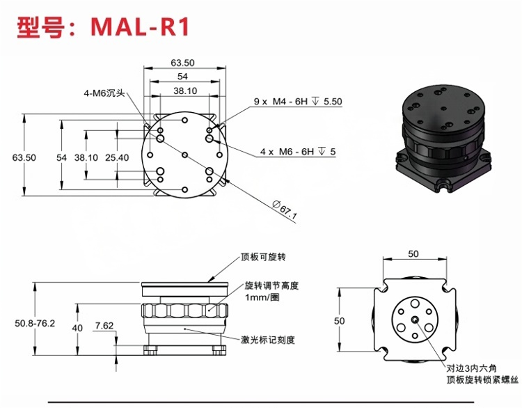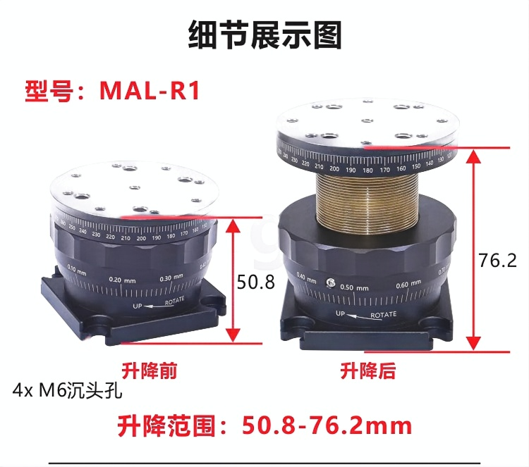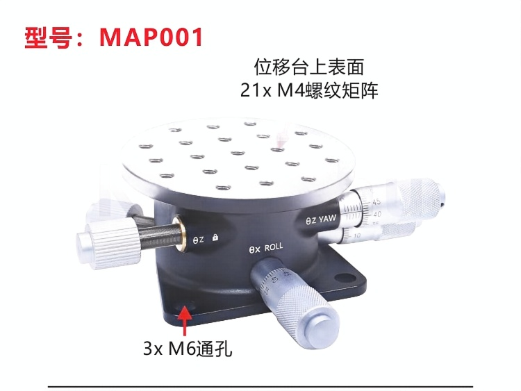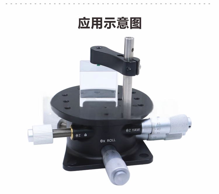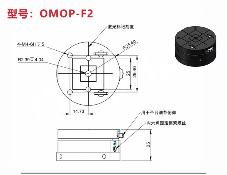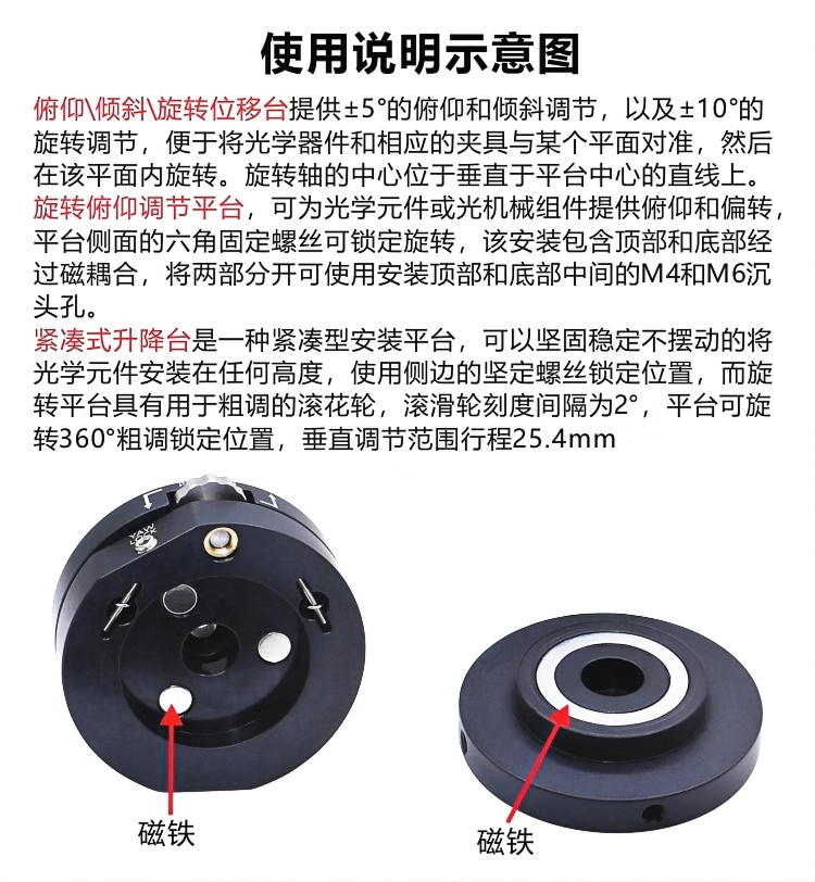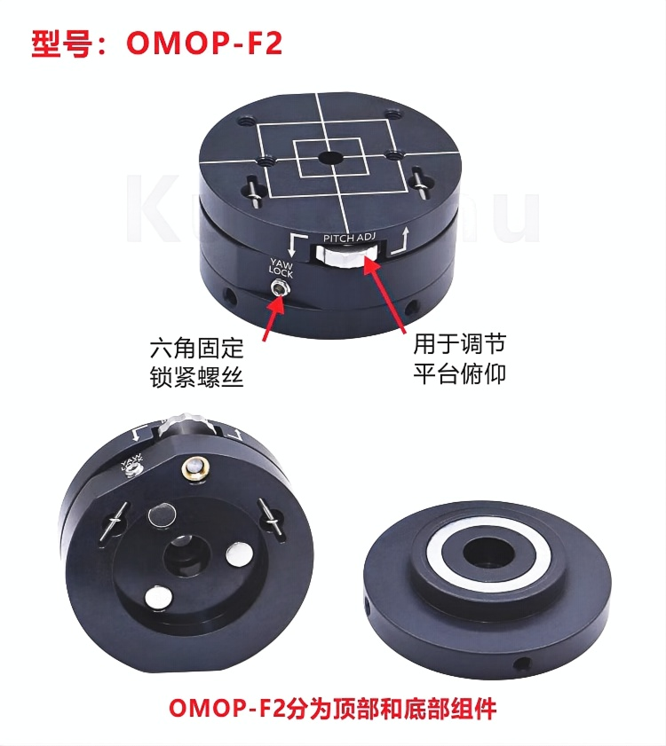 旋转俯仰调节平台可为光学元件或光机械组件提供俯仰和偏转调节。平台包含顶部和底座,顶部具有可在可移除的底板顶部旋转的俯仰调节;这两部分经过磁耦合。安装座侧面的六角固定螺丝可锁定旋转,且顶部和底部均具有平坦表面,可用作旋转调节的参考点。±3俯仰调节由安装座顶板上的手拧旋轮控制。 手拧旋轮提供±3°的俯仰调节。360°连续旋转,带六角锁定固定螺丝。平台直径50.8mm,距安装座底部高度为25.4mm。由阳极氧化发黑的铝材制成