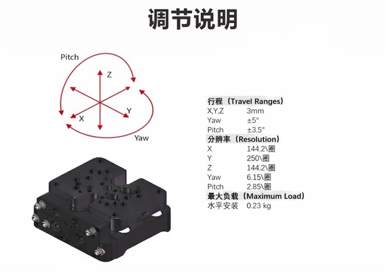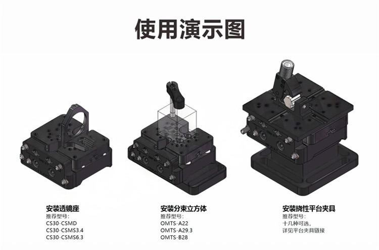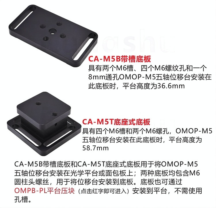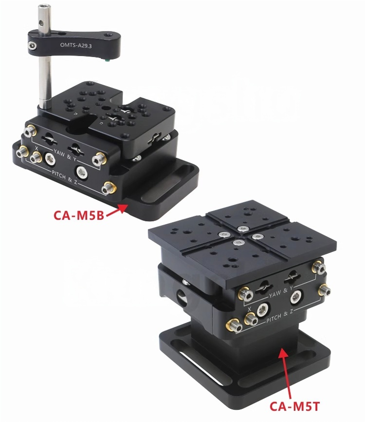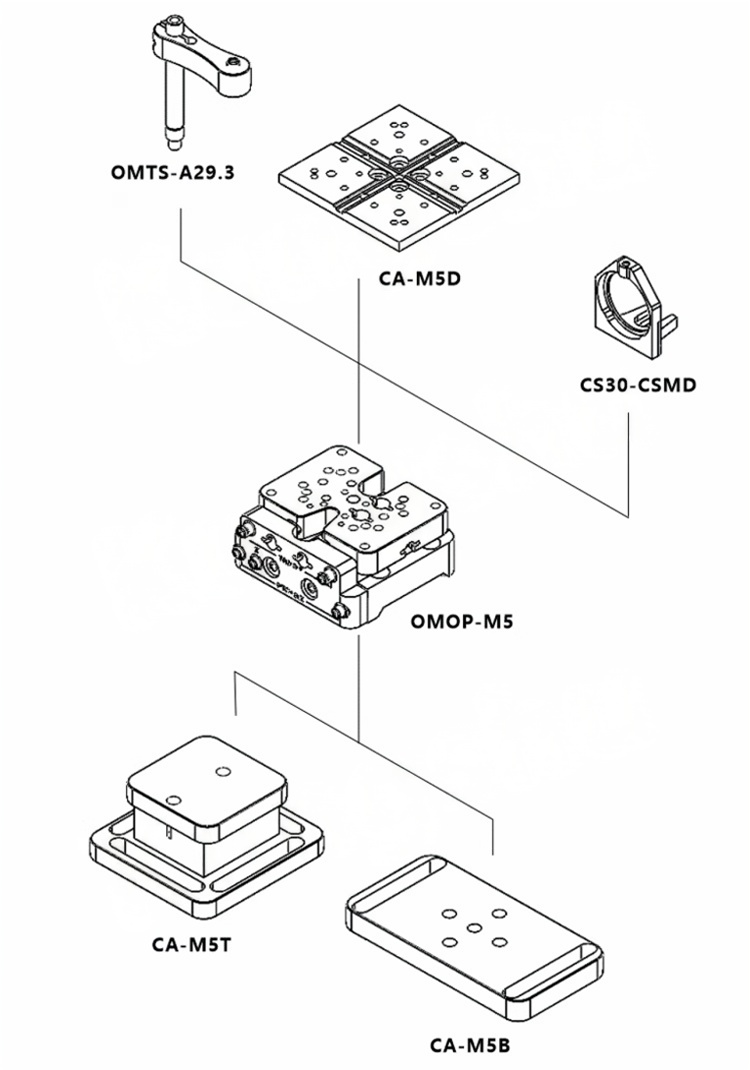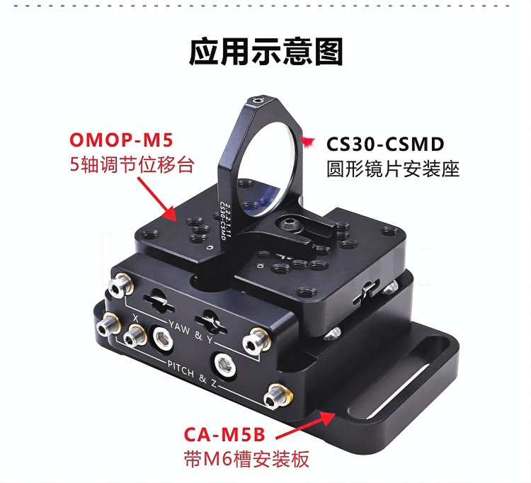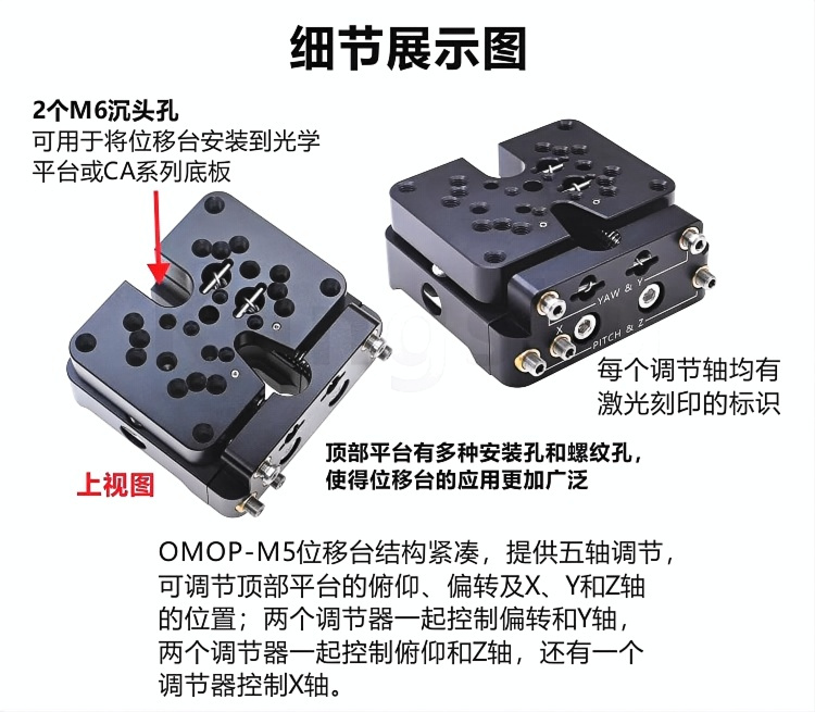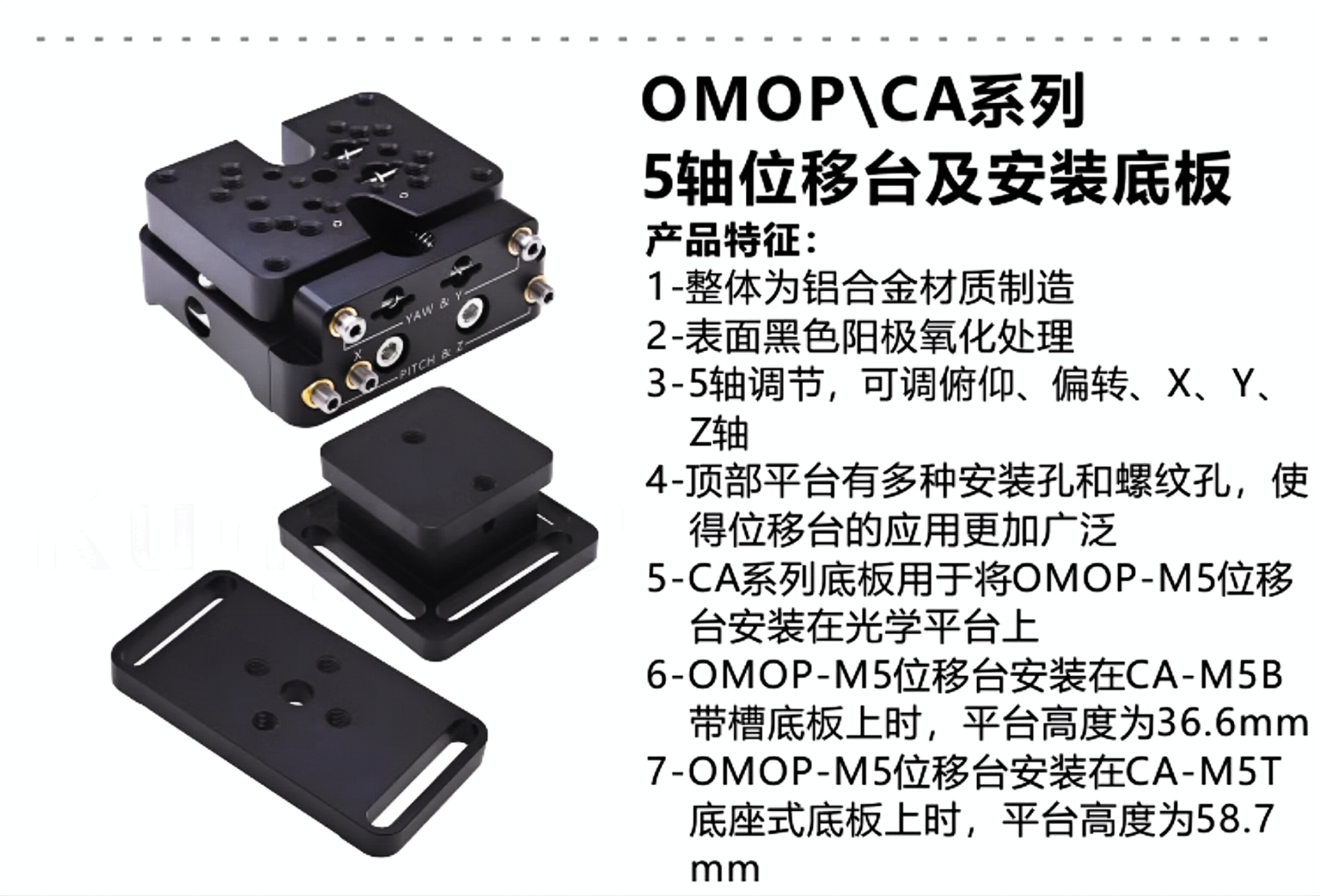 整体为铝合金材质制造。表面黑色阳极氧化处理。5轴调节,可调俯仰、偏转、X、Y. Z轴。顶部平台有多种安装孔和螺纹孔,使得位移台的应用更加广泛。CA系列底板用于将OMOP-M5位移台安装在光学平台上。OMOP-M5位移台安装在CA-M5B带槽底板上时,平台高度为36.6mm。OMOP-M5位移台安装在CA-M5T底座式底板上时,平台高度为58.7 mm
