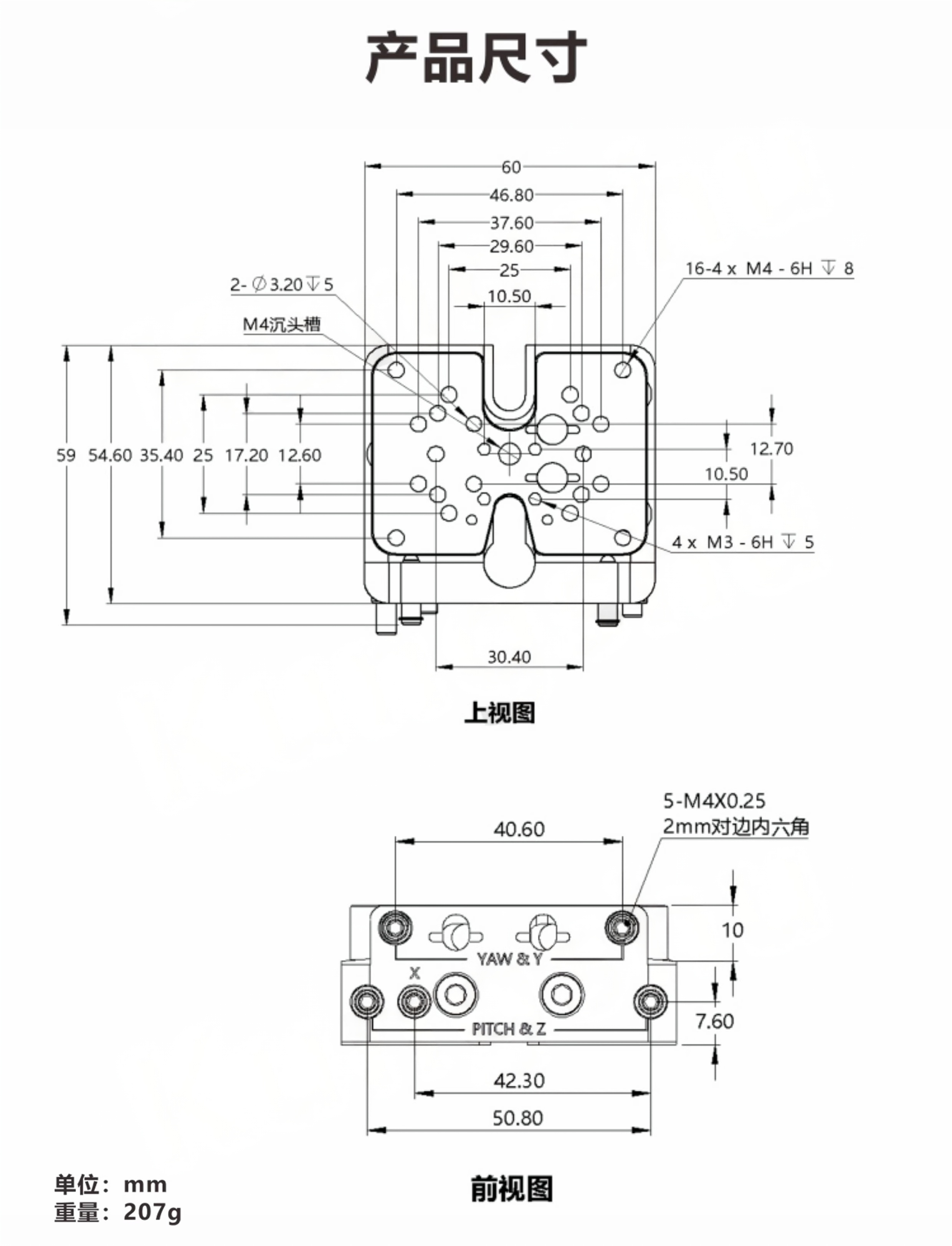 OMOP-M5位移台有5个调节器,可使用2mm六角扳手便捷调节顶部 平台的俯仰、偏转以及X、Y、Z轴的位置;底部具有两个M6沉头孔, 可用于将位移台安装到光学平台或该系列的安装板上。顶部平台有多 种安装孔和螺纹孔,使得该位移台能应用于不同的场景中;如下图, 顶部平台的M4螺纹孔兼容我们的压臂(链接在下方详情页内),孔的配置 使得压臂的尼龙头锁紧螺丝位于顶部平台的中心上方。除此之外,我们 还提供安装底板,以便将OMOP-M5位移台安装在光学平台或面包板上。
