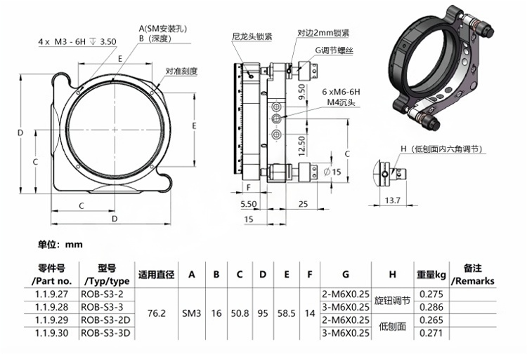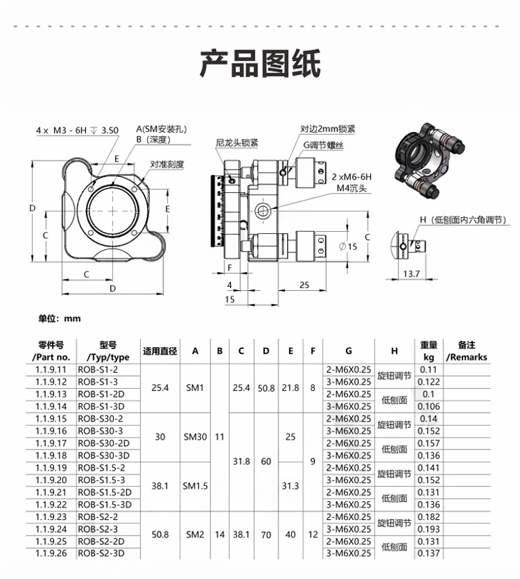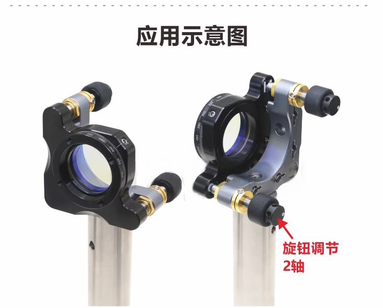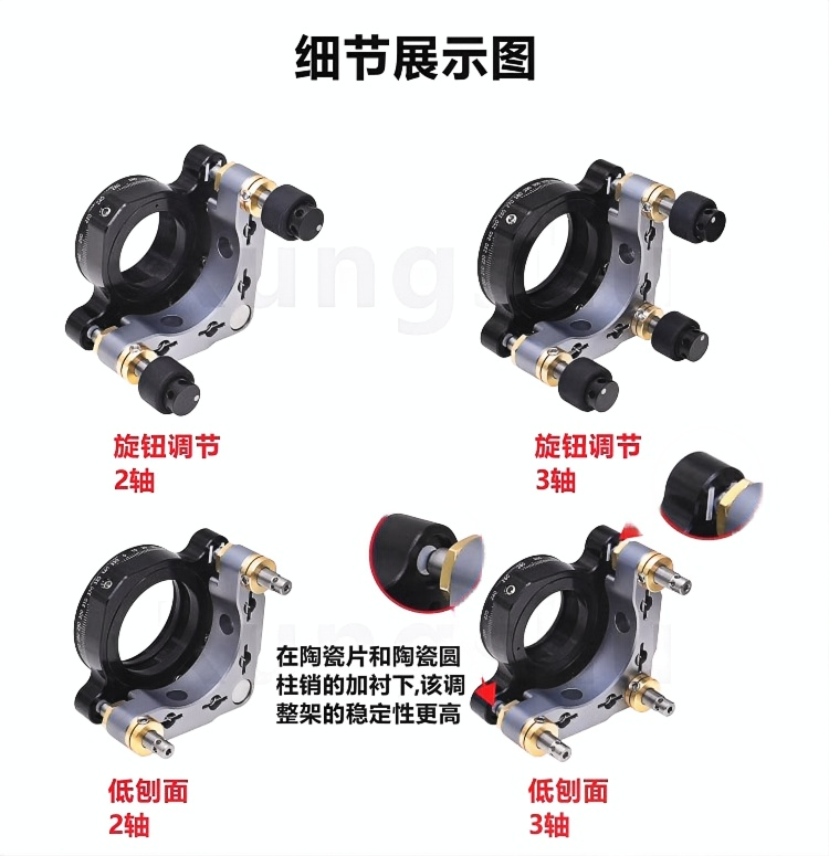 整体为铝合金材质制造。表面黑色阳极氧化处理。可用于安装光学元件。在陶瓷片和圆柱销的加衬下,耐磨性更高、稳定性更高。旋钮调节和低刨面两种可选;调节轴可选两轴或三轴。螺纹安装孔可选:SM1、SM30、SM1.5、SM2、SM3五种螺纹可选。橡胶圈带侧孔旋钮防滑以及耐磨性强,使用起来也更加的便捷