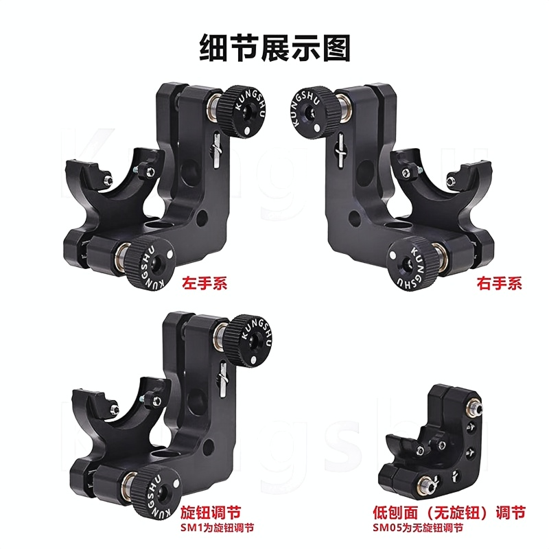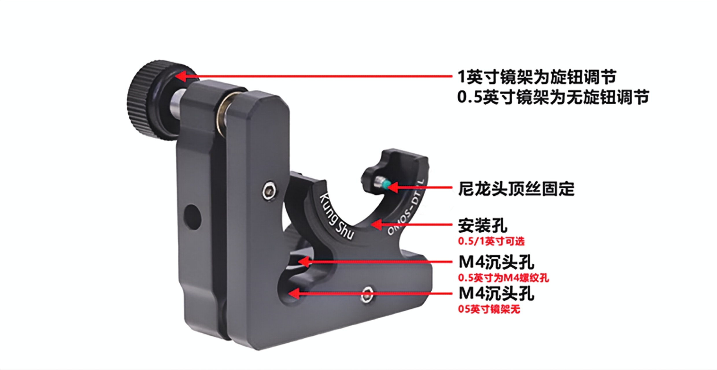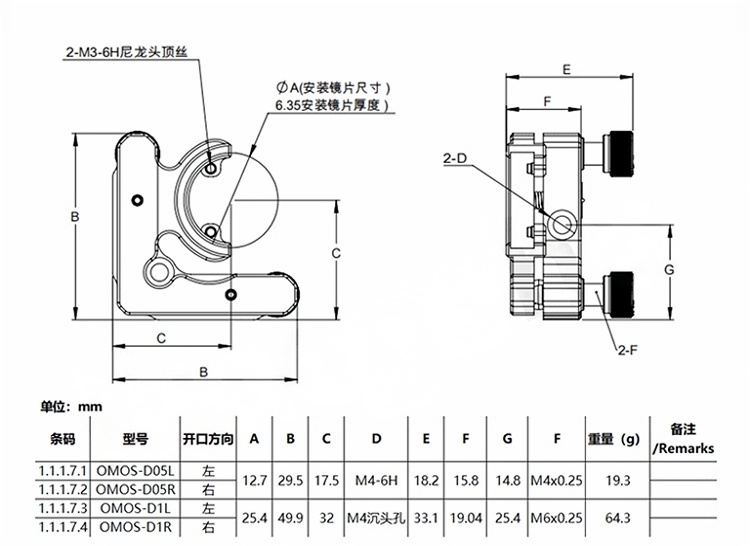 D型光学调整架专门设计用于安装我们的0.5英寸或1英寸的D型反射镜;反射镜通过两个尼龙头固定螺丝固定到光学调整架中,该调整架设计紧凑,最大限度的增加通光空间,在光束选取能避免其他光束。调整架±4°的调节范围,通过旋钮(六角扳手)实现调整。调整架有左右之分,两侧带有M4的沉头孔,可安装到接杆上。0.5英寸调整及啊不配备旋钮,可将其用于狭窄空间中。