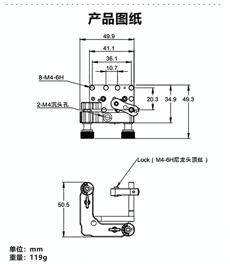 可拆卸前面板棱镜侧方调节安装平台具有双轴调节功能,且都有一个带M4螺孔的安装平台,能够安装我们的压臂。调整架的背板具有M4)螺孔,用于安装到12.7mm光学接杆。光学平台调整架提供较大的安装表面,且光路不会受到调节器阻挡;光学棱镜调整架更为紧凑,可以通过改变平台实现左手系或右手系配置。安装面板通过两个螺钉固定到L块上,可通过六角扳手拧动螺钉进行拆卸。 用于固定1英寸以下的光学立方体元件。实现正负4°的俯仰角度调节。带两个M6X0.25细牙促动器,带挠性锁紧功能(可以加装三个促动器型号)。整体航空铝制造,表面黑色阳极氧化。前方面板可拆卸。配有压臂