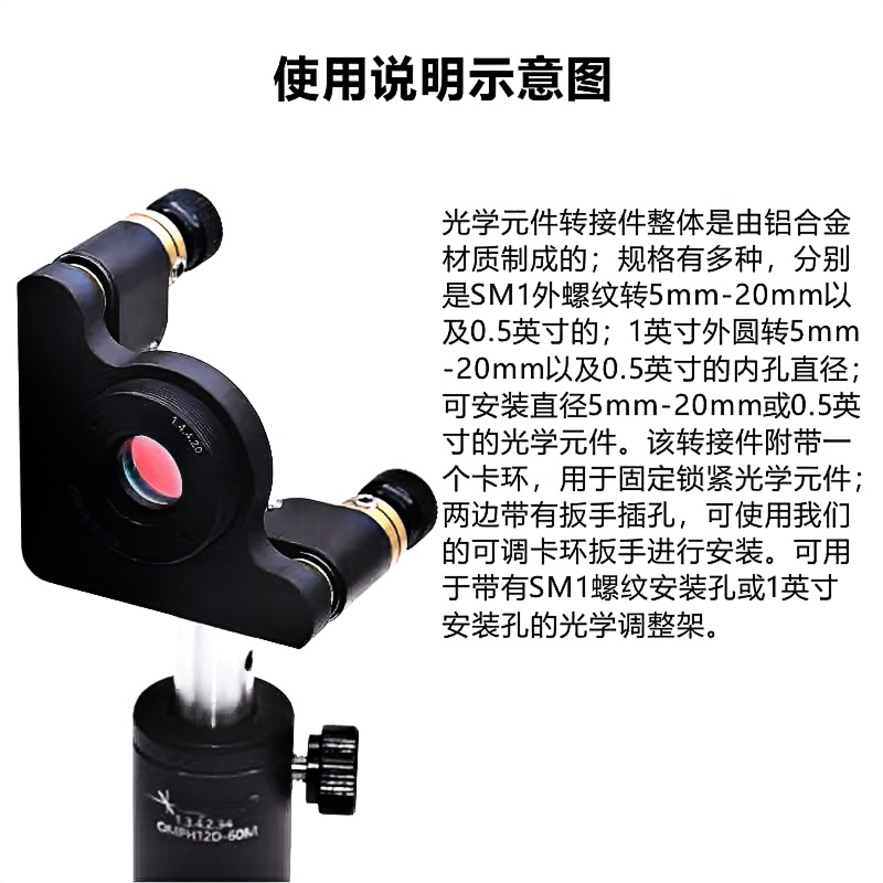 光学元件转接件整体是由铝合金材质制成的;规格有多种,分别是SM1外螺纹转5mm-20mm以及0.5英寸的;1英寸外圆转5mm20mm以及0.5英寸的内孔直径;可安装直径5mm-20mm或0.5英寸的光学元件。该转接件附带一个卡环,用于固定锁紧光学元件;两边带有扳手插孔,可使用我们的可调卡环扳手进行安装。可用于带有SM1螺纹安装孔或1英寸安装孔的光学调整架。