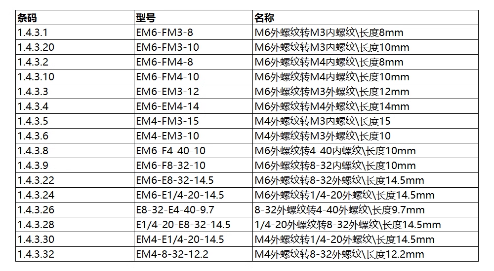 材料为SUS304不锈钢加工,防水防腐蚀 坚固耐用匠心工艺 表面顺滑。除EM4-FM3-15型号外,其他均为一字开口,宽度1.2mm。多种螺纹型号转接 多种转接方式 ,可满足多种内螺纹或外螺纹的转接 ,可实现螺纹之间不同型号的自由转接,应用广泛。有单件、袋装(10pcs)、盒装(100pcs)可选,分别优惠10%和20%。支持定制另外款式 详细请咨询客服。
