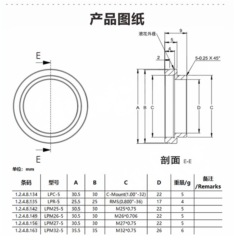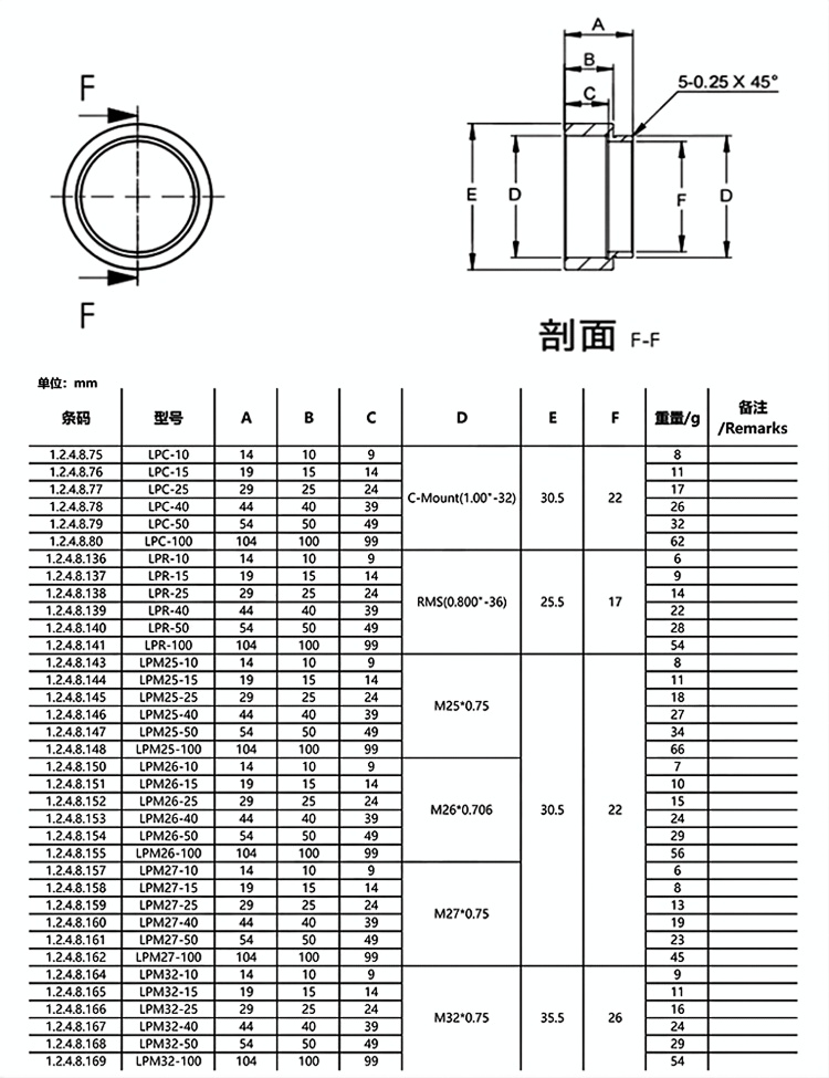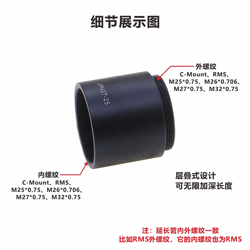 整体为铝合金材质制造。表面阳极氧化处理。层叠式设计可无限叠加长度。兼容任何C-Mount的组件以及SM1透镜套筒的夹具和安装座。10mm、15mm、25mm、40mm、50mm、100mm六种长度可选。该延长管内不附带C-Mount卡环。支持定制