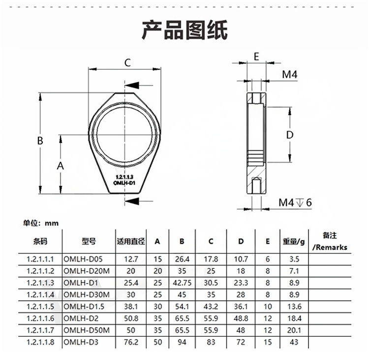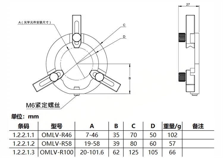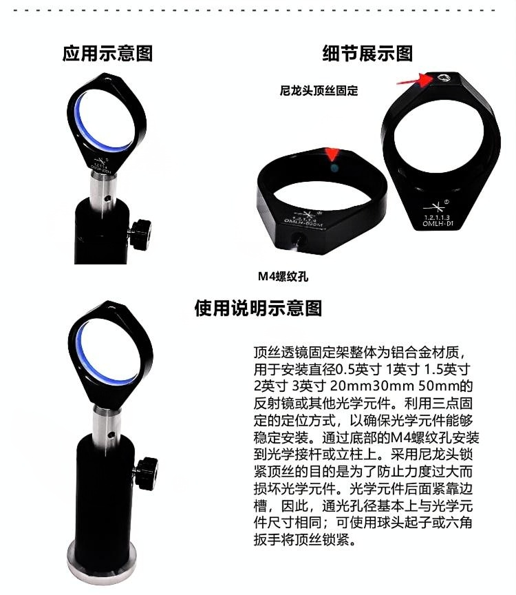 整体为铝合金材质制造。表面黑色阳极氧化处理。底部均为M4螺纹安装孔。三点固定的定位方式 以确保光学元 件可稳定安装。尼龙头锁紧顶丝可防止力度过大而损坏光学元件。可安装直径0.5英寸 1英寸1.5英寸2英寸3英寸20mm30mm50mm的光学元件。支持定制