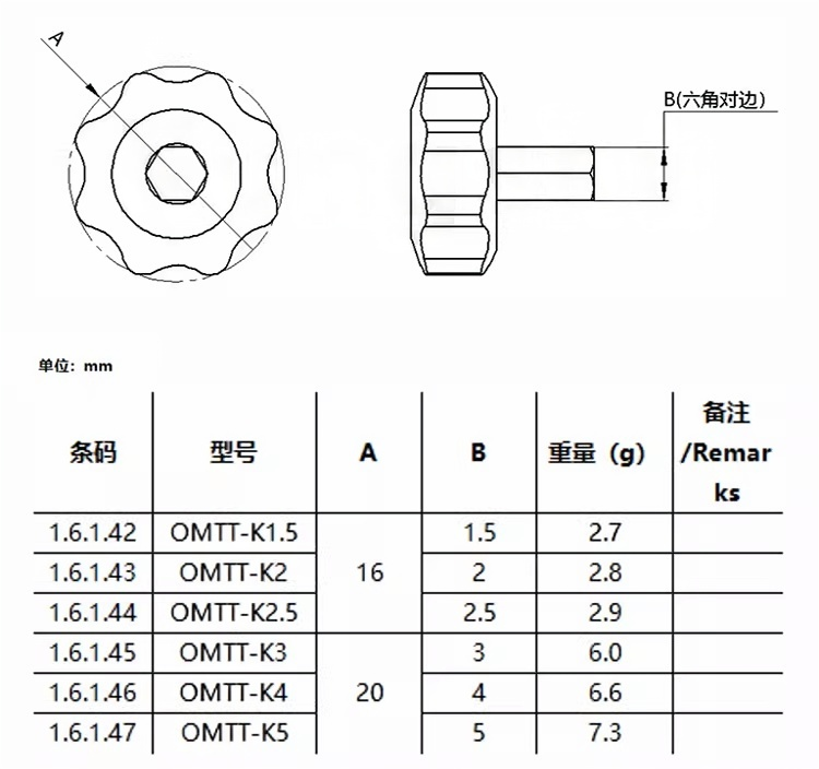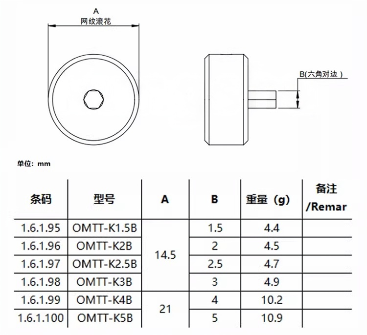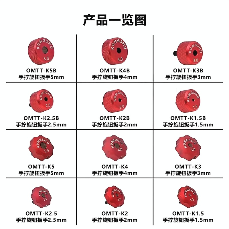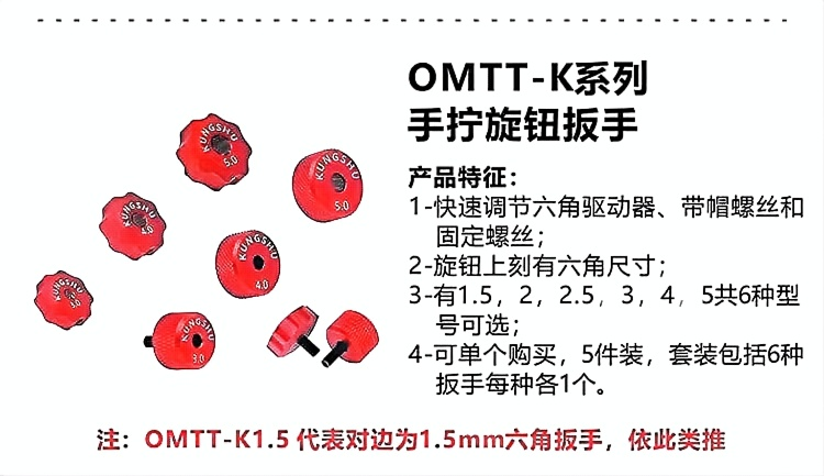 六角扳旋钮扳手可以快速调节内六角驱动螺纹副、带帽螺丝和固定螺丝,在调节过程中可以留在螺丝的六角插孔中,提高使用便利性。 手拧专用扳手。外径设计相比于一般滚花,提供更大的扭矩。有1.5,2,2.5,3,4,5共6种型号可选可单个购买,5件装,套装多种选择套装包括6种扳手每种各1个OMTT-K1.5 代表对边为1.5mm六角扳手,依此类推