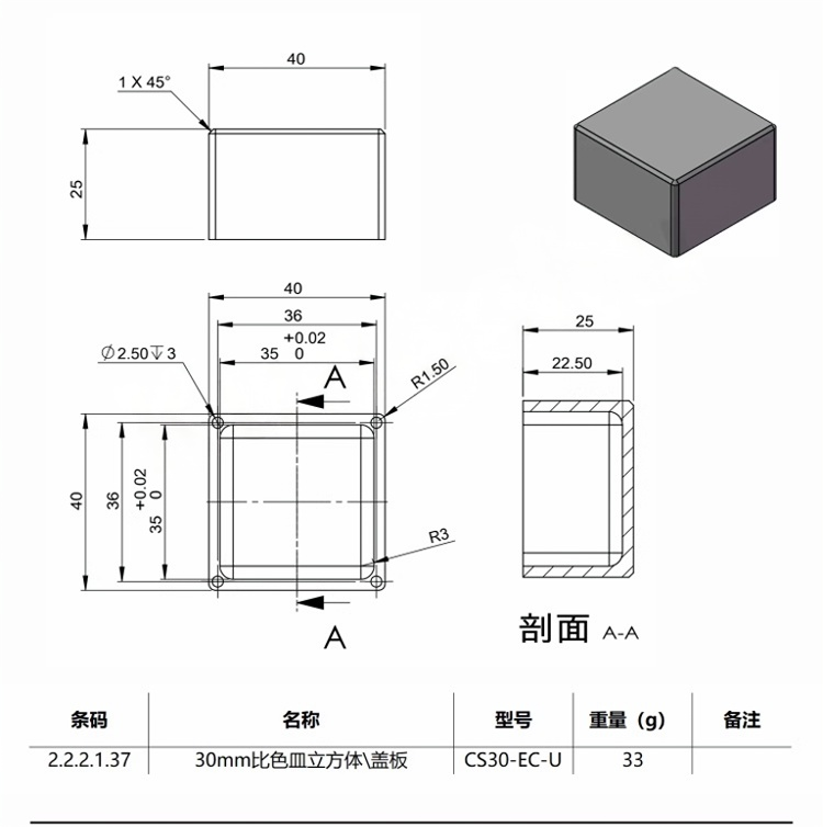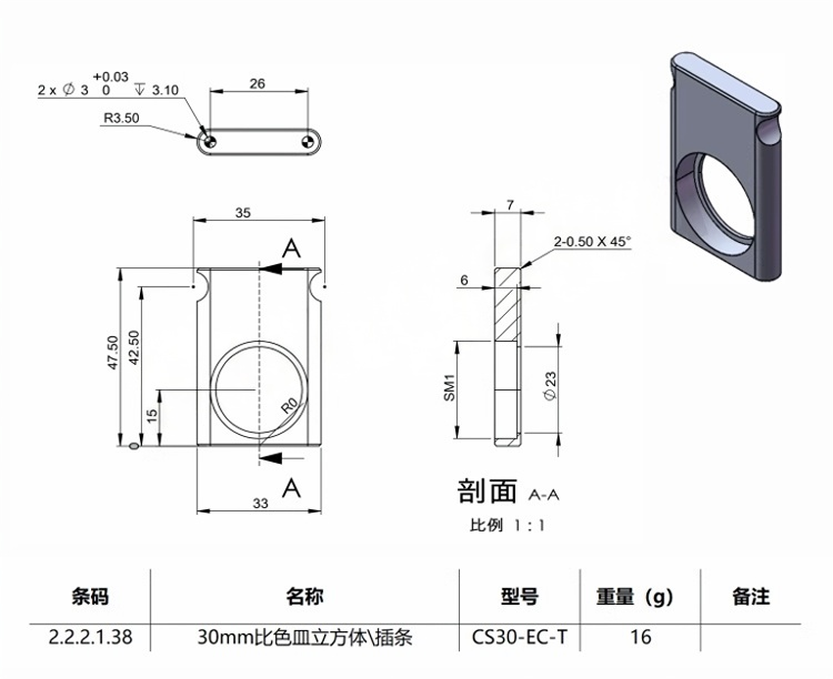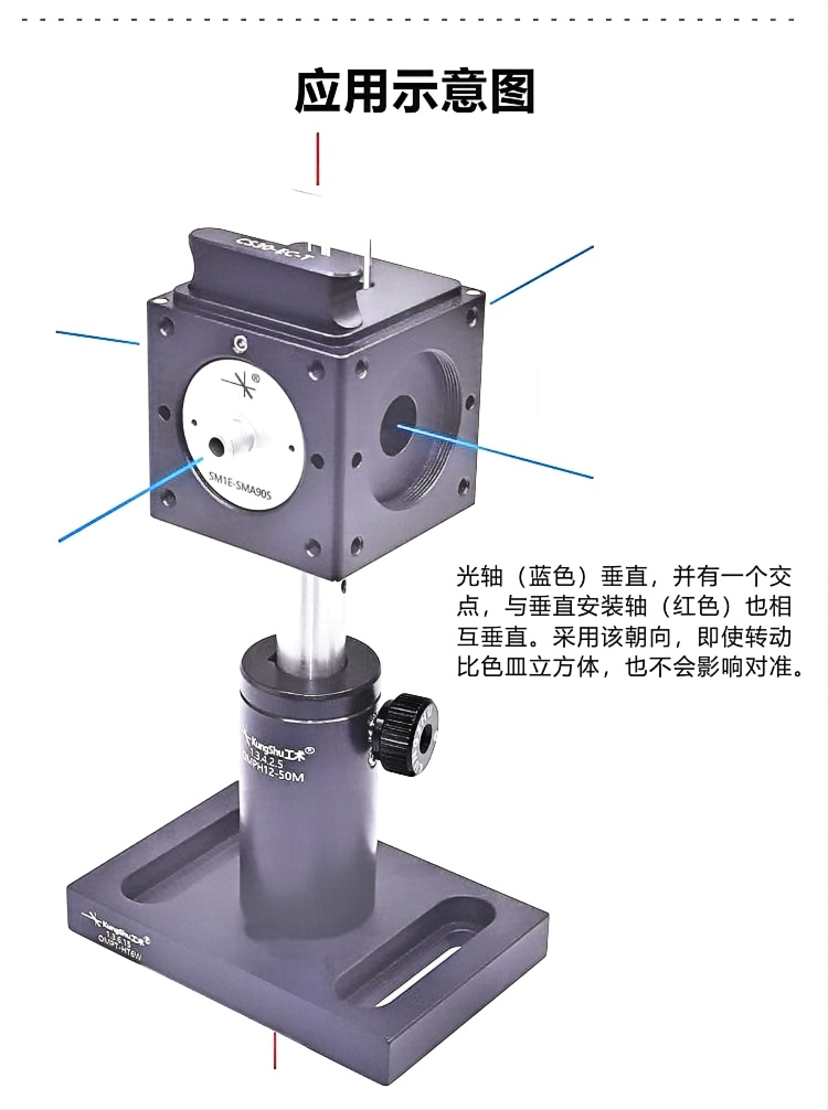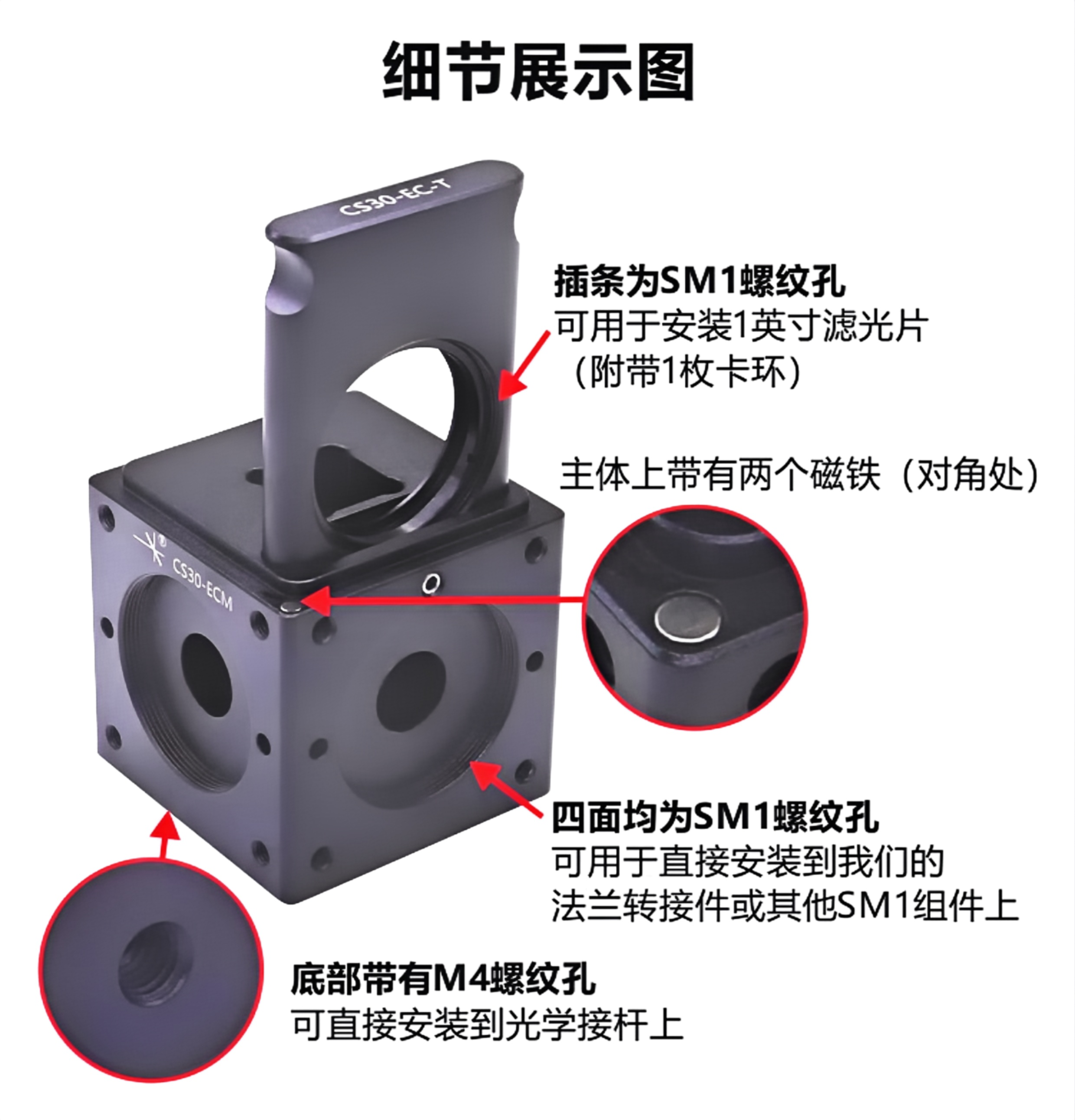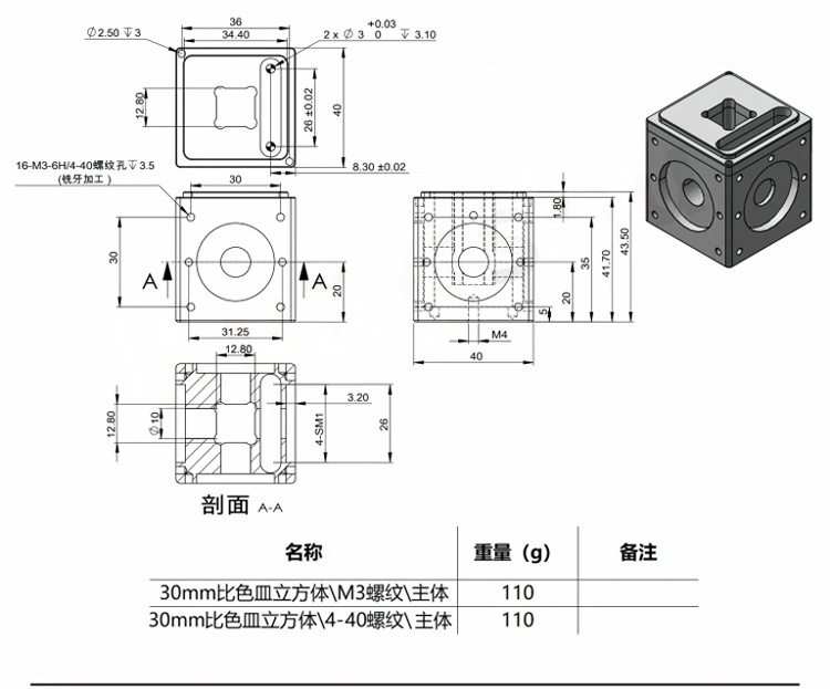 整体为铝合金材质制造。表面黑色阳极氧化处理。适用于自由空间和光纤应用。用于夹持12.5mmx12.5mmx45mm 的比色皿。导杆安装孔可选M3或4-40。底部安装孔为M4螺纹,可用于安装光学接杆。兼容30mm笼式系统和SM1螺纹组件