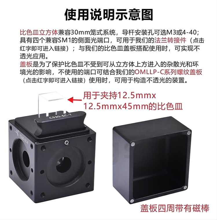 比色皿立方体兼容30mm笼式系统,导杆安装孔可选M3或4-40; 具有四个兼容SM1的侧面光端口,可用于我们的法兰转接件;与 我们的比色皿盖板搭配使用时,可实现不透光应用。 盖板是为了保护比色皿不受到可从立方体上方进入的杂散光和环 境光的影响,不使用的端口可结合我们的OMLLP-C系列螺纹盖 板(链接在下方详情页内)使用时,可用于构造不透光的装置。