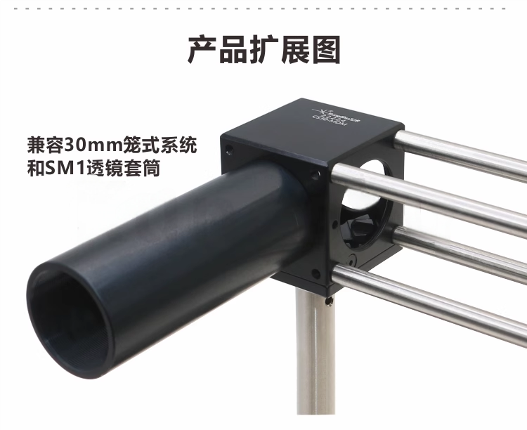 整体材料为铝合金。表面黑色阳极氧化处理。兼容30mm笼式和SM1透镜套筒。可拆卸外壳,便于安装和更换光学元件。底部均带有M4螺纹孔,可用于安装接杆。导杆安装孔可选M3或4-40。固定方式可选:夹紧式二向色、压紧式、黏结式、尼龙头顶丝固定式