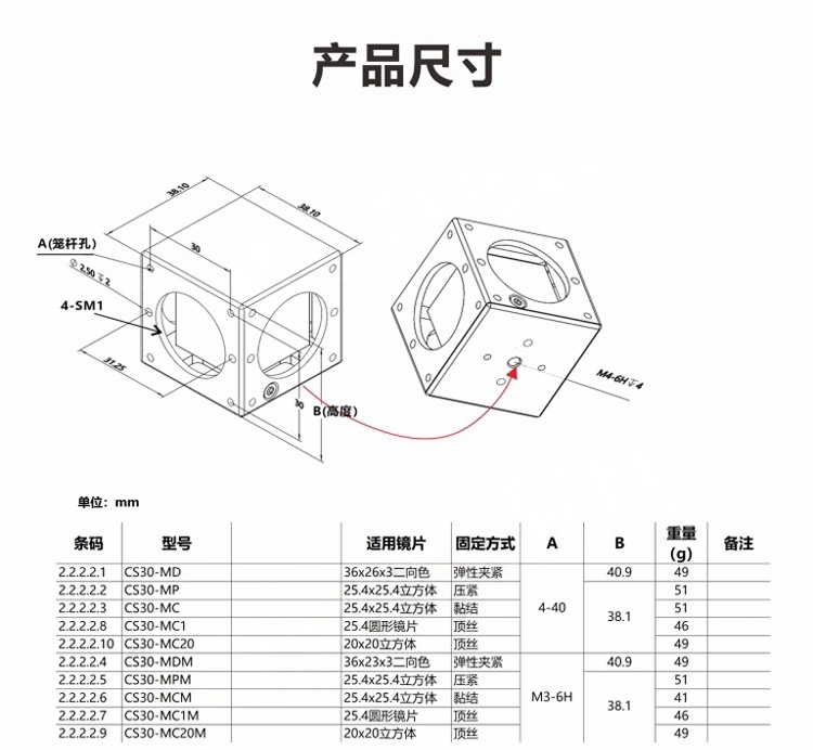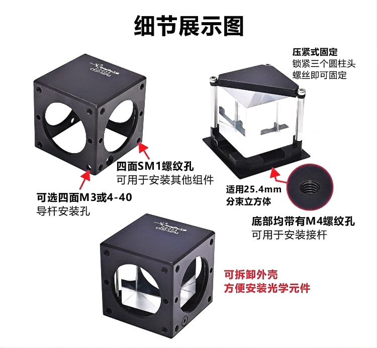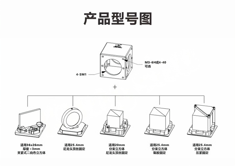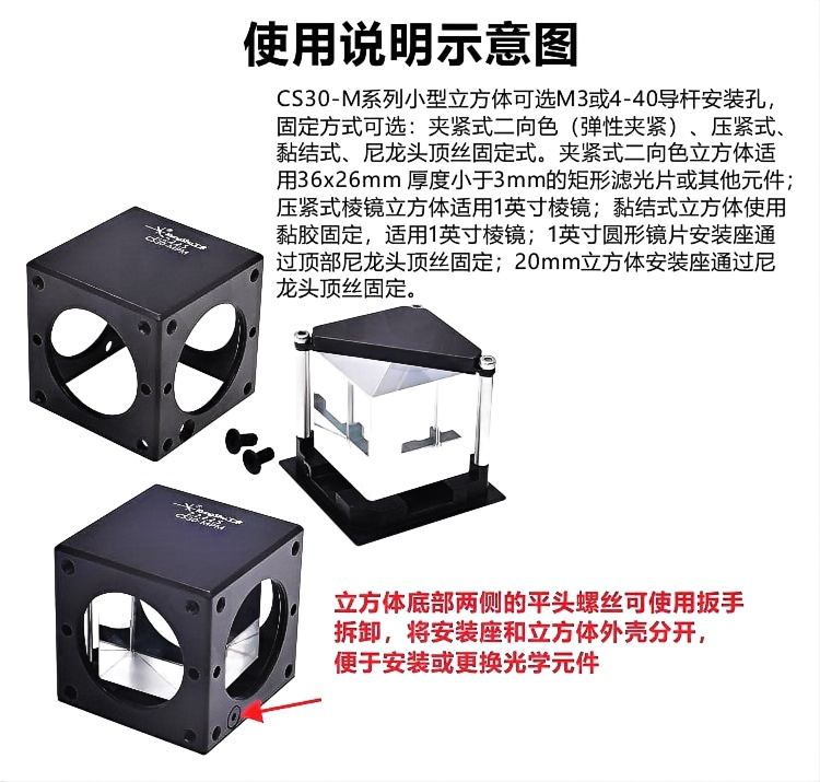 CS30-M系列小型立方体可选M3或4-40导杆安装孔,固定方式可选:夹紧式二向色(弹性夹紧)、压紧式黏结式、尼龙头顶丝固定式。夹紧式二向色立方体适用36x26mm厚度小于3mm的矩形滤光片或其他元件,压紧式棱镜立方体适用1英寸棱镜;黏结式立方体使用黏胶固定,适用1英寸棱镜;1英寸圆形镜片安装座通过顶部尼龙头顶丝固定;20mm立方体安装座通过尼龙头顶丝固定。