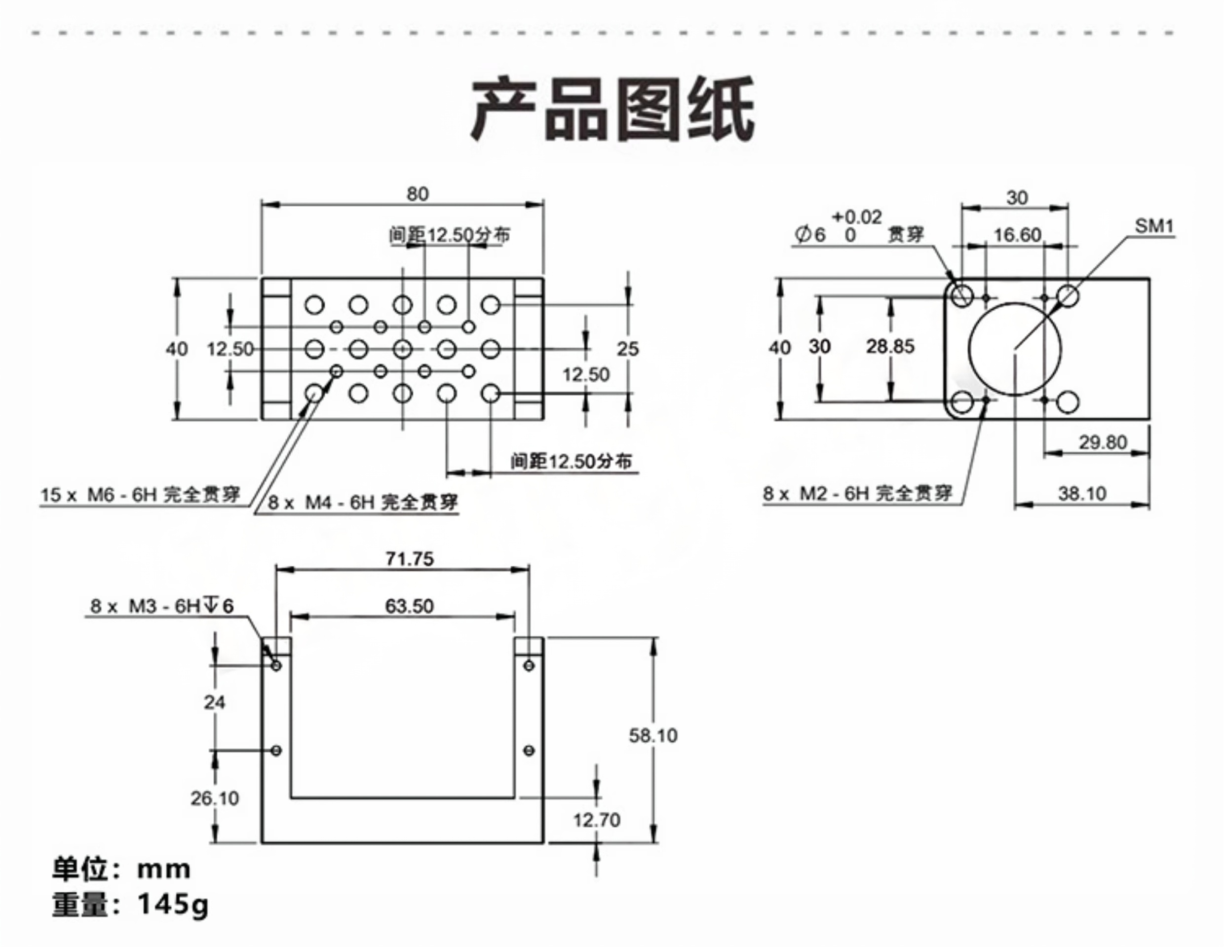 笼式系统U形台在标准的30mm笼式系统或类似的透镜套简装置内部提供了一个螺纹安装面。一些不适合标准笼式支杆的小光学部件,丰富的螺纹孔提供了在U形台构建小光学组件所必需的灵活性。实心一体式结构通过精密加工而构建成刚性结构,以提供稳定性并保持整个系统的对准性 兼容30mm笼式系统的安装平台。为在笼式结构中安装各种光学组件提供更大空间。两端均有SM1(1.035"-40)螺纹孔。便于集成光学元件到平台