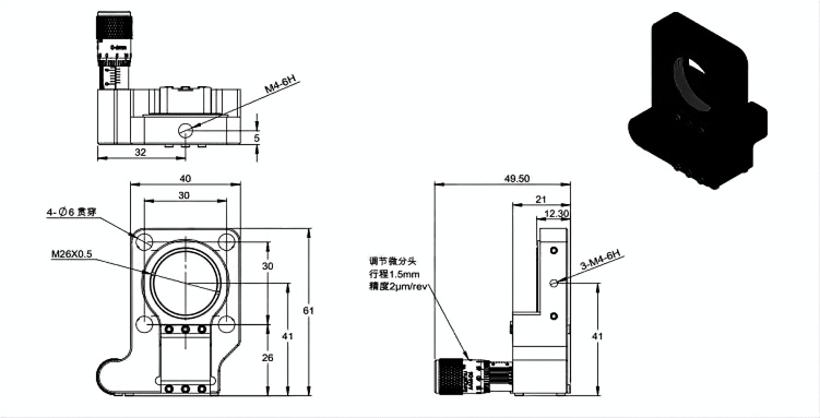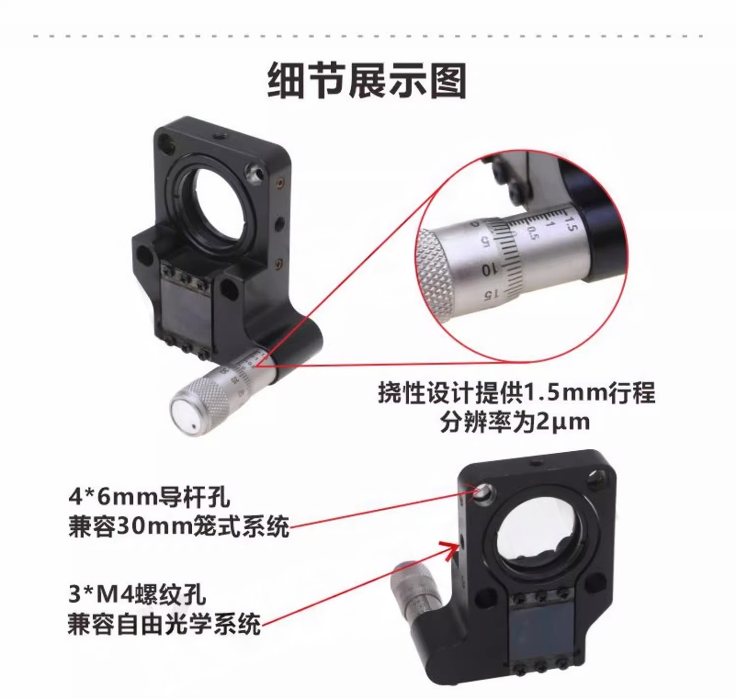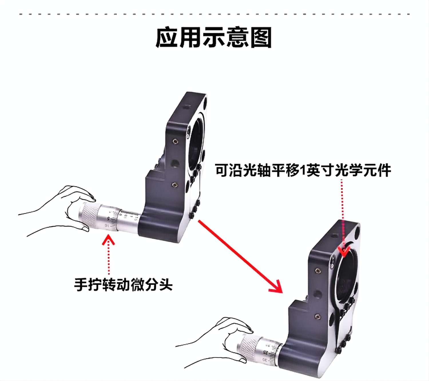 CS30-KZ笼式Z轴平移安装座是可沿光轴方向精密定位的光学安装座。在30 mm同轴系统内提供可重复的Z轴行程,可用于同轴系统中的光纤对准或者空间滤波的应用中补偿聚焦误差。安装孔为SM1(1.035"-40)内螺纹,兼容sm1螺纹组件,促动旋钮分辨为2 µm,最大可调行程1.5 mm 兼容30 mm笼式系统。安装最大厚度7.1 mm的Ø1英寸光学元件。促动旋钮分辨为2 µm,最大可调行程1.5 mm。SM1(1.035”-40)螺纹孔兼容我们的SM1透镜套管