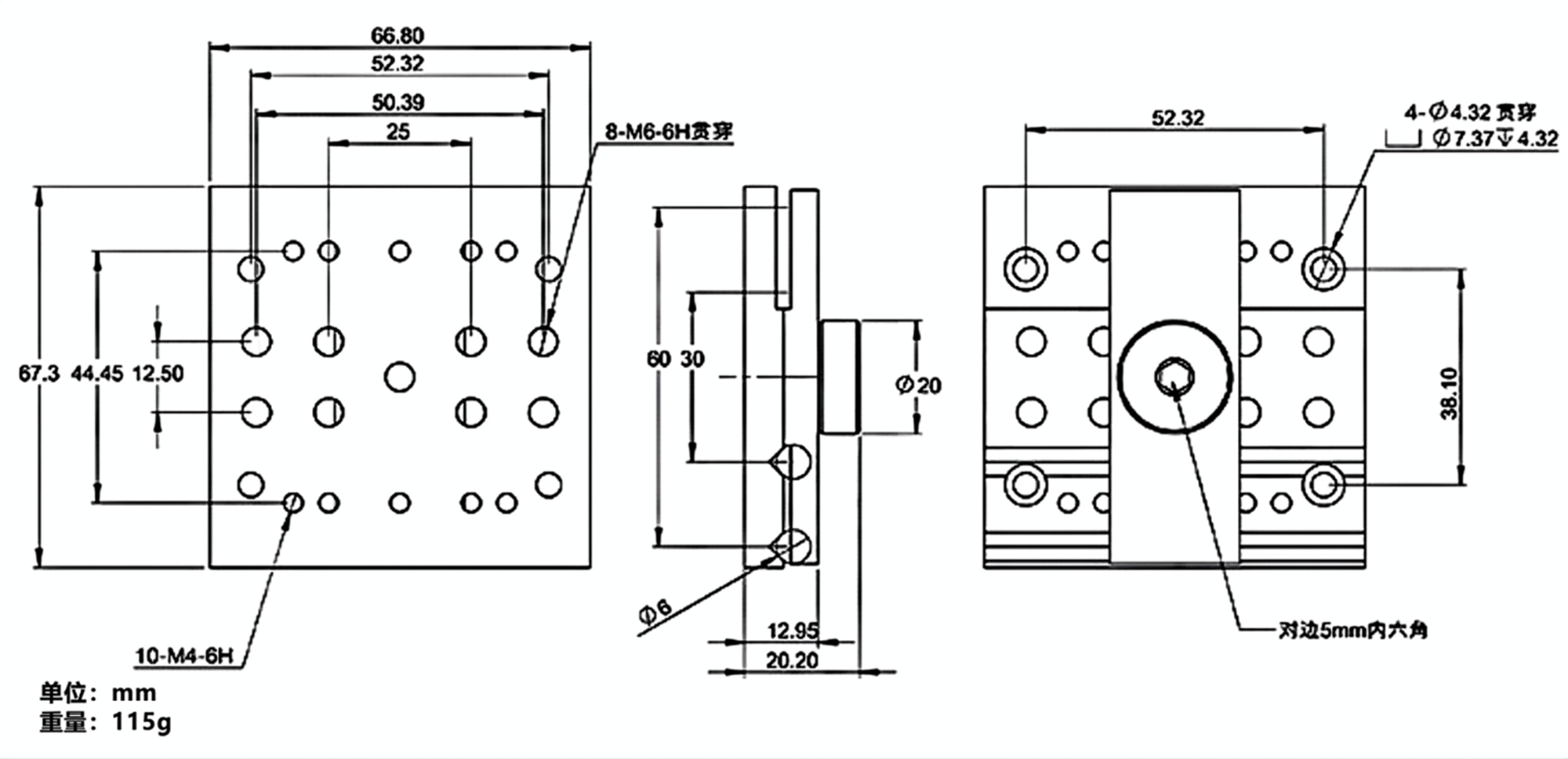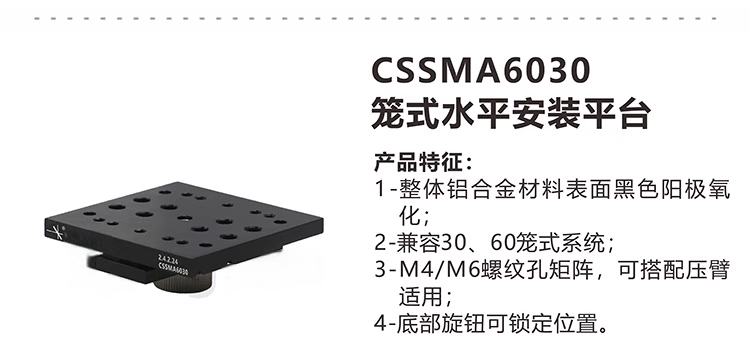 笼式水平安装平台铝合金材质制造,大尺寸安装表面 ,M4/M6安装螺纹矩阵,可以搭配 压臂使用;安装上光学元件后拧紧压紧螺丝,即可夹持住光学元件。 大尺寸安装表面。表面有M6、M4螺孔矩阵。位于底部的旋钮用于位置锁定。匹配30 mm和60 mm笼式系统。5 mm六角锁紧螺丝