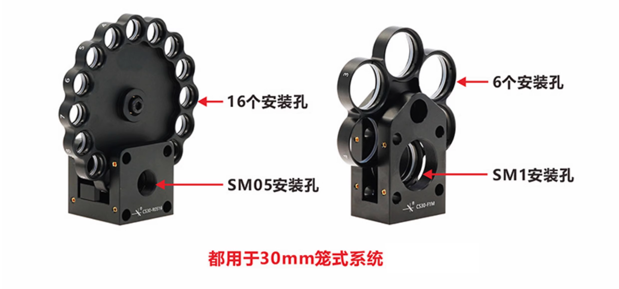 快速旋转转轮可以切换滤光片 ,适用于集成到笼式系统当中 有16mm\30mm\60mm笼式系统三种型号可选,提供用于Ø1/2英寸(Ø12.5 mm)、Ø1英寸(Ø25 mm)和Ø2英寸(Ø50 mm)滤光片的版本 滤光片轮槽口带有SM05、SM1或SM2螺纹。SM螺纹端口,兼容透镜套管