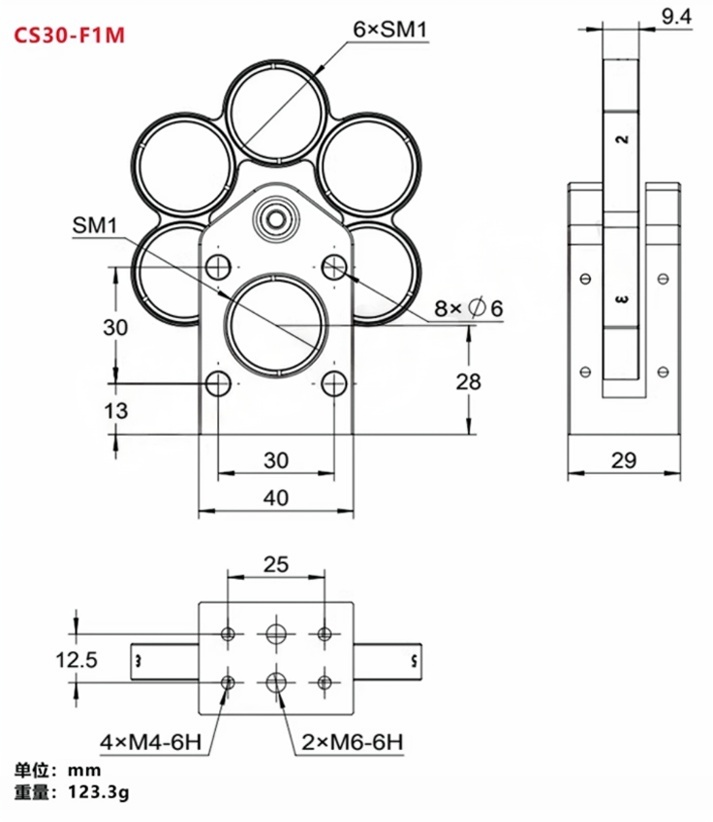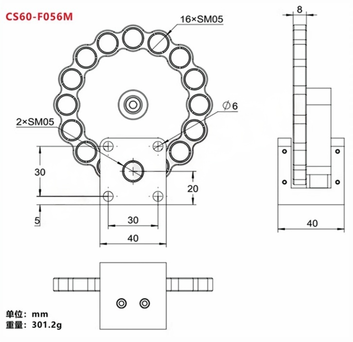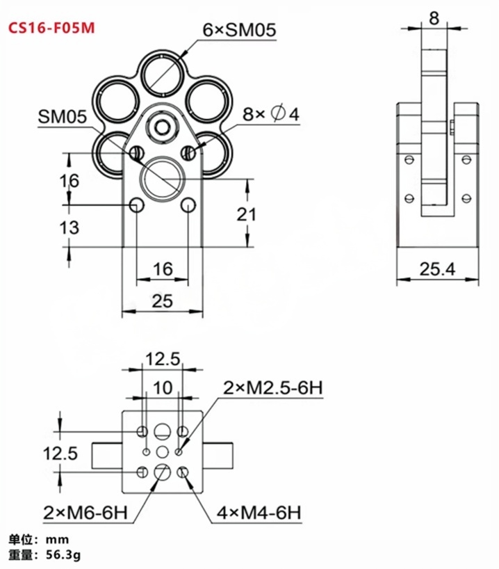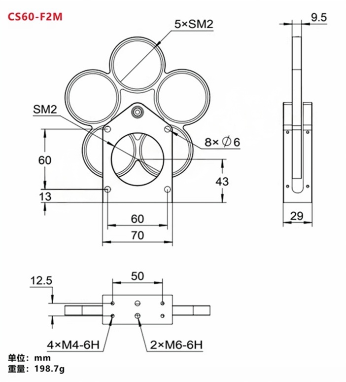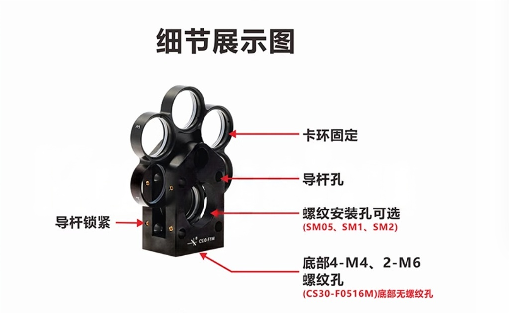 快速旋转转轮可以切换滤光片 ,适用于集成到笼式系统当中。有16mm\30mm\60mm笼式系统三种型号可选,提供用于Ø1/2英寸(Ø12.5 mm)、Ø1英寸(Ø25 mm)和Ø2英寸(Ø50 mm)滤光片的版本。滤光片轮槽口带有SM05、SM1或SM2螺纹。SM螺纹端口,兼容透镜套管, 内附卡环。底部带M4螺纹,也可以方便适用在自由空间中。整体铝合金黑色阳极氧化。支持定制服务