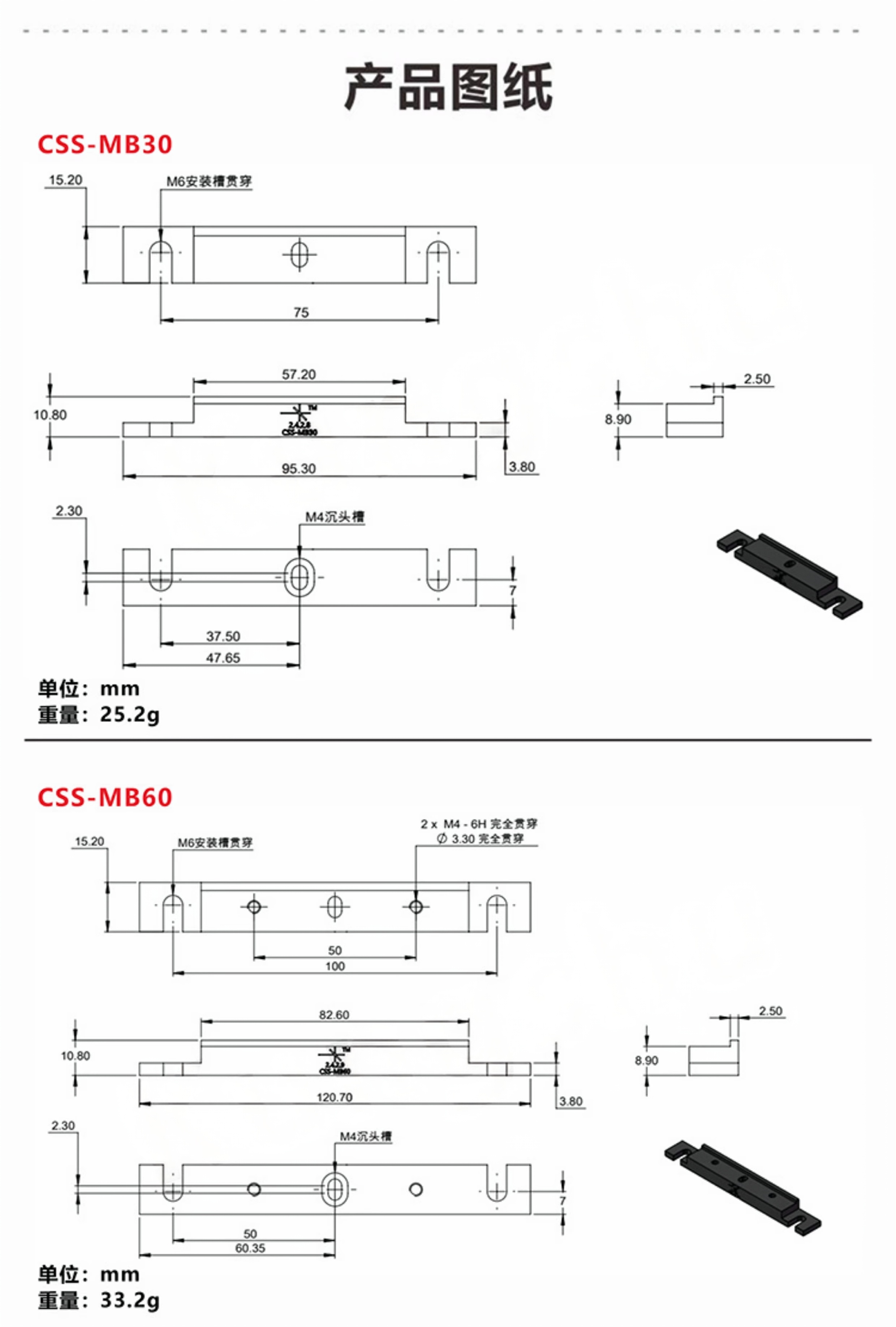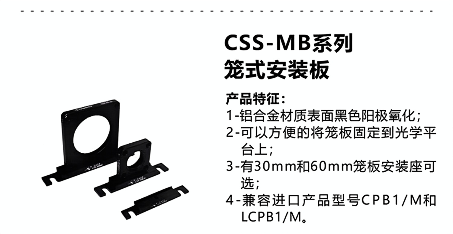这款底座通过M6孔槽可将30mm和60mm的笼板通过底部沉头孔固定至安装座上,底座上同时具有一个凸起的边缘块,来防止笼板受力时旋转。 薄型笼板底座,将笼板水平安装至光学平台上;兼容30mm笼板或60mm笼板;附带1个M4和2个M6圆柱头螺丝,2个M6垫片。整体铝合金制造,表面黑色阳极氧化;