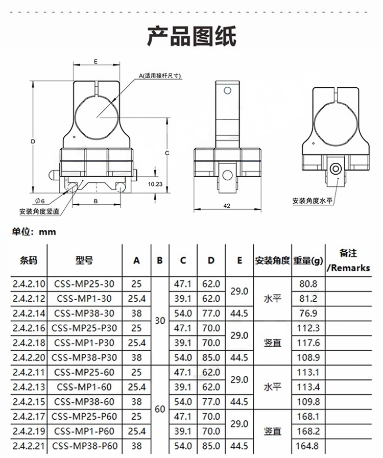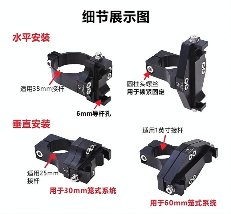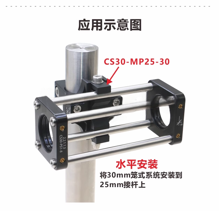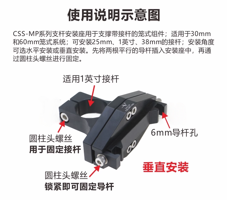 CSS-MP系列安装架可用于30mm和60mm笼式系统。两根平行笼杆插入安装架中,通过单个螺丝固定。一根接杆就能支撑整个笼式系统。使用螺丝可将夹具固定在接杆上,从而将安装架固定在接杆上。 快速连接夹持式安装架,用于30mm和60mm笼式系统;用于笼式系统水平和垂直牢固安装;兼容25mm、1英寸、38mm直径接杆;可快速稳定的搭建笼式系统;整体铝合金,阳极氧化发黑
