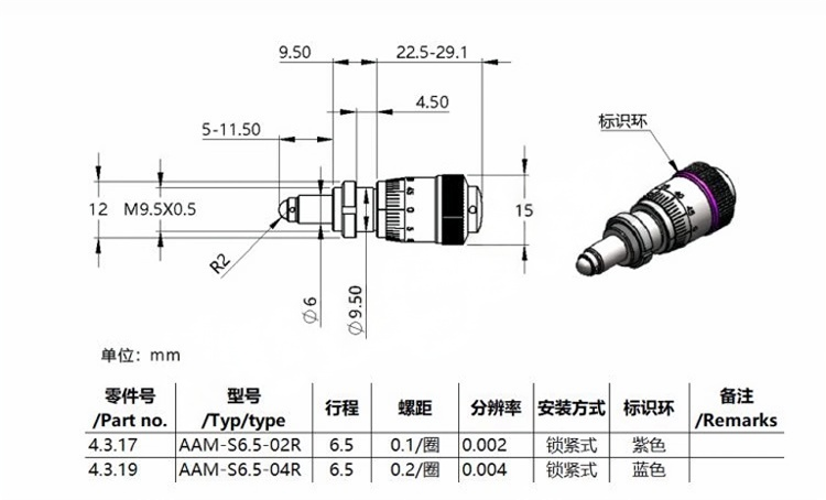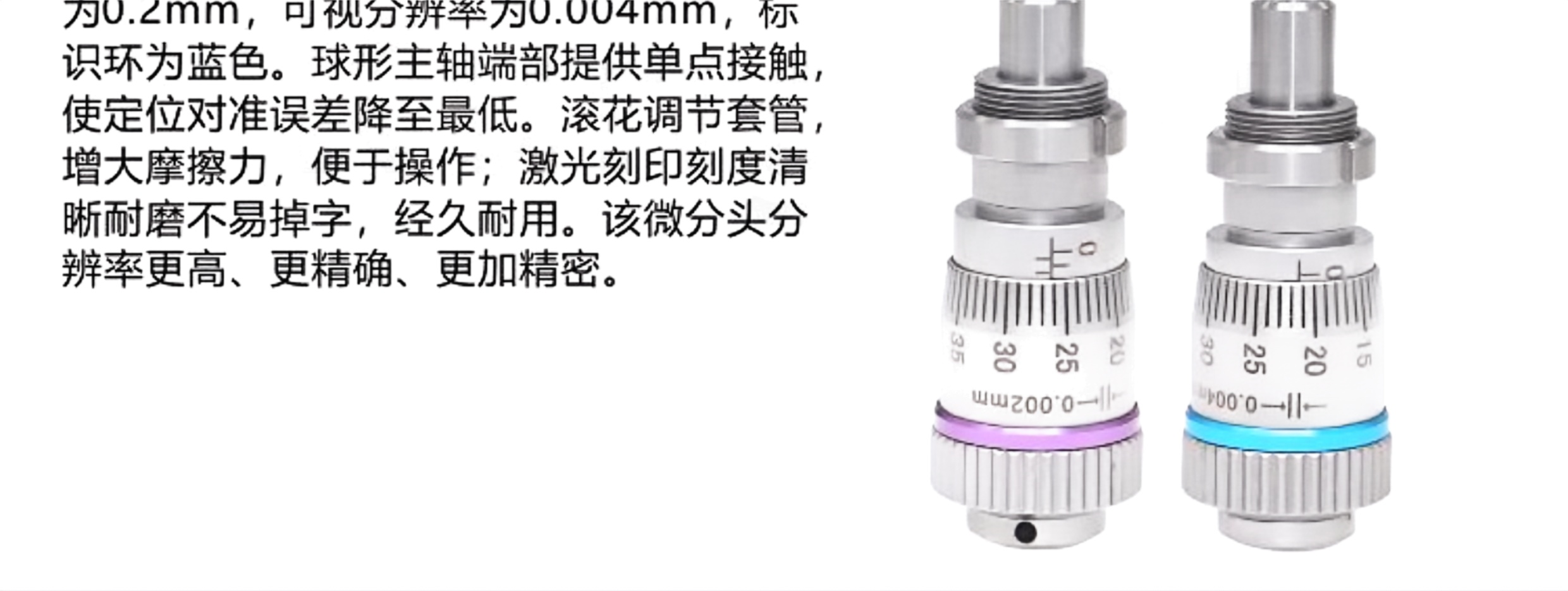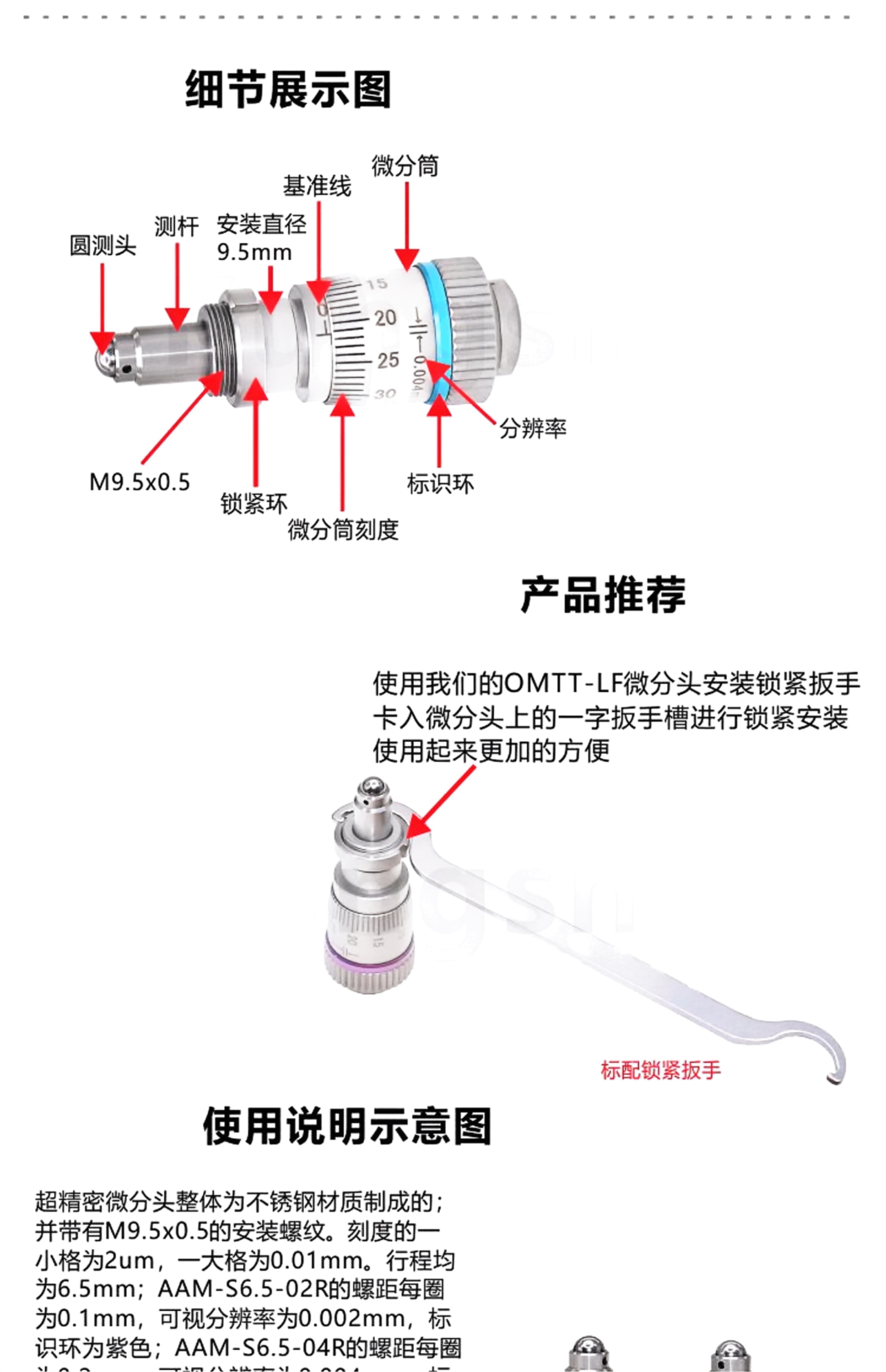 1-整体不锈钢材料制造 2-紫色标识环每圈前进0.1mm,刻度分辨率0.002mm;蓝色标识环前进0.2mm,刻度分辨率0.004mm 3-行程6.5mm 4-安装直径为9.5mm,带有M9.5x0.5锁紧环,用于安装固定,标配有锁紧扳手 5-激光刻印刻度清晰 耐磨 经久耐用6-滚花调节套管,便于操作