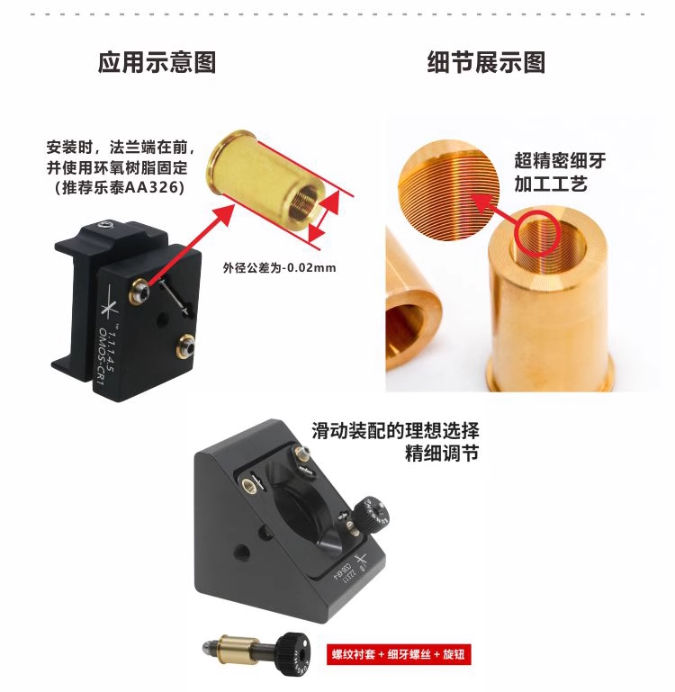 1 -材料为黄铜 2-多种规格可选 3-滑动装配的理想选择 4-需要配合对应牙距的细牙螺丝使用 5-可与AAAS-S系列六角调节器搭配使用 6-用于精细调节器集成 7-支持定制