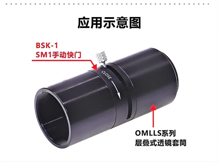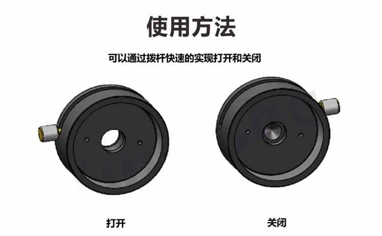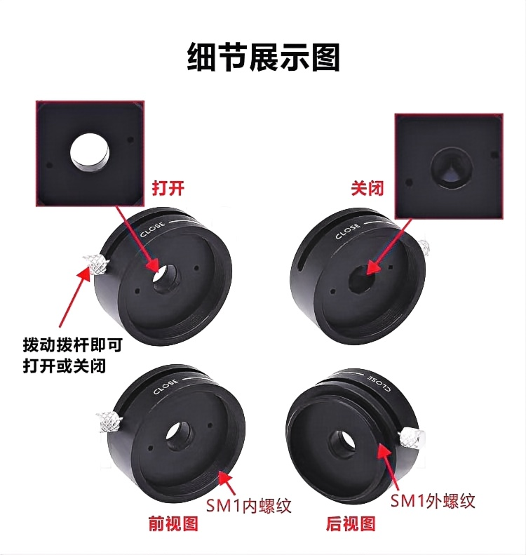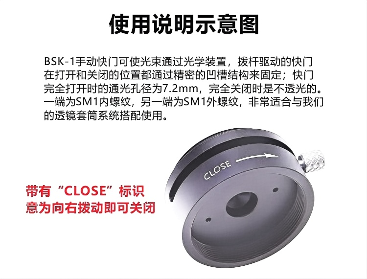 BSK-1手动快门可使光束通过光学装置,拨杆驱动的快门在打开和关闭的位置都通过精密的凹槽结构来固定;快门完全打开时的通光孔为7.2mm,完全关闭时是不透光的。一端为SM1内螺纹,另一端为SM1外螺纹,非常适合与我们的透镜套筒系统搭配使用。 整体为铝合金材质制造。表面黑色阳极氧化处理。通过拨动拨杆即可打开或关闭快门。具有SM1内螺纹和SM1外螺纹。完全打开时通光孔径为7.2mm,完全关闭时不会透光