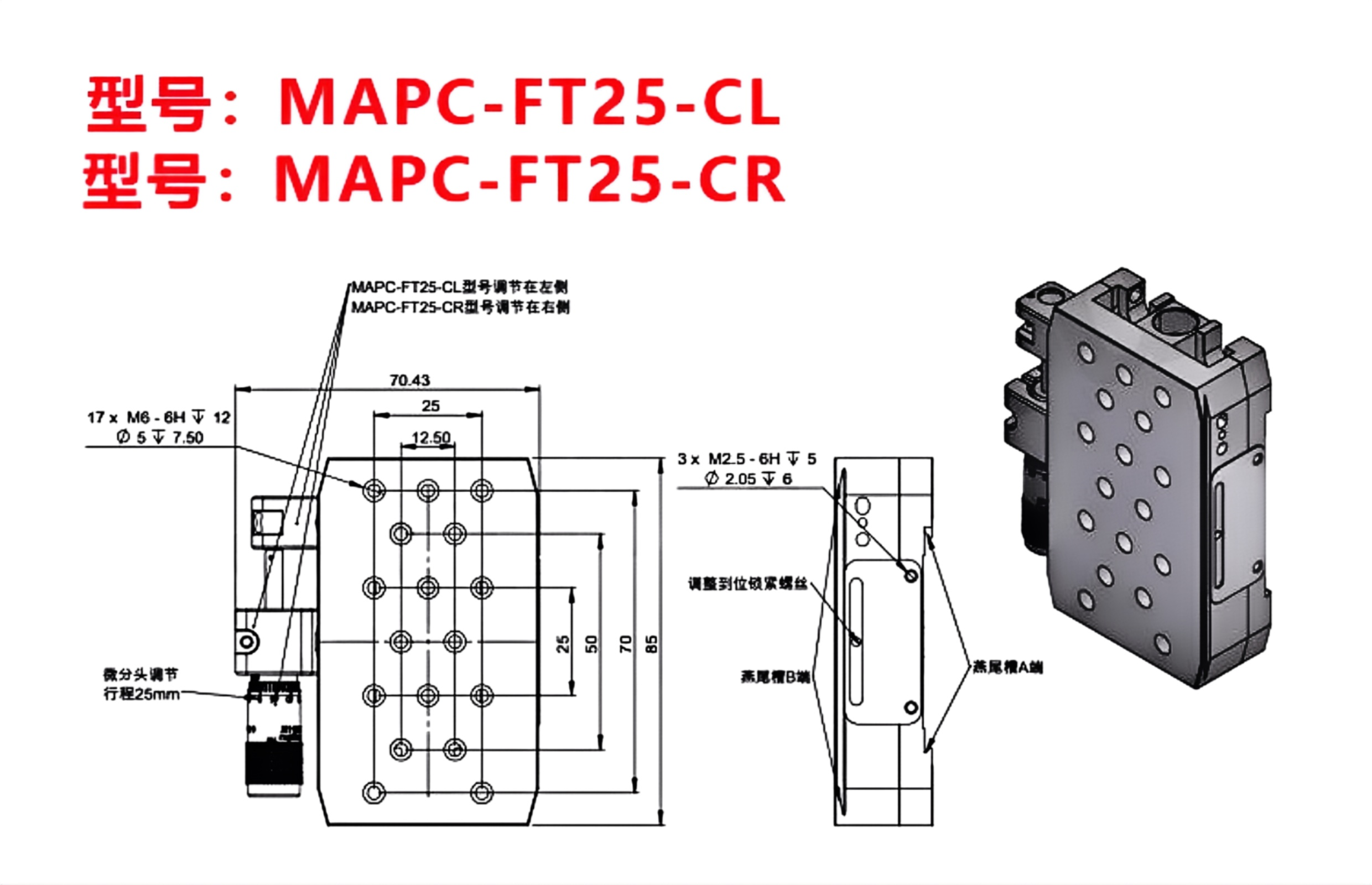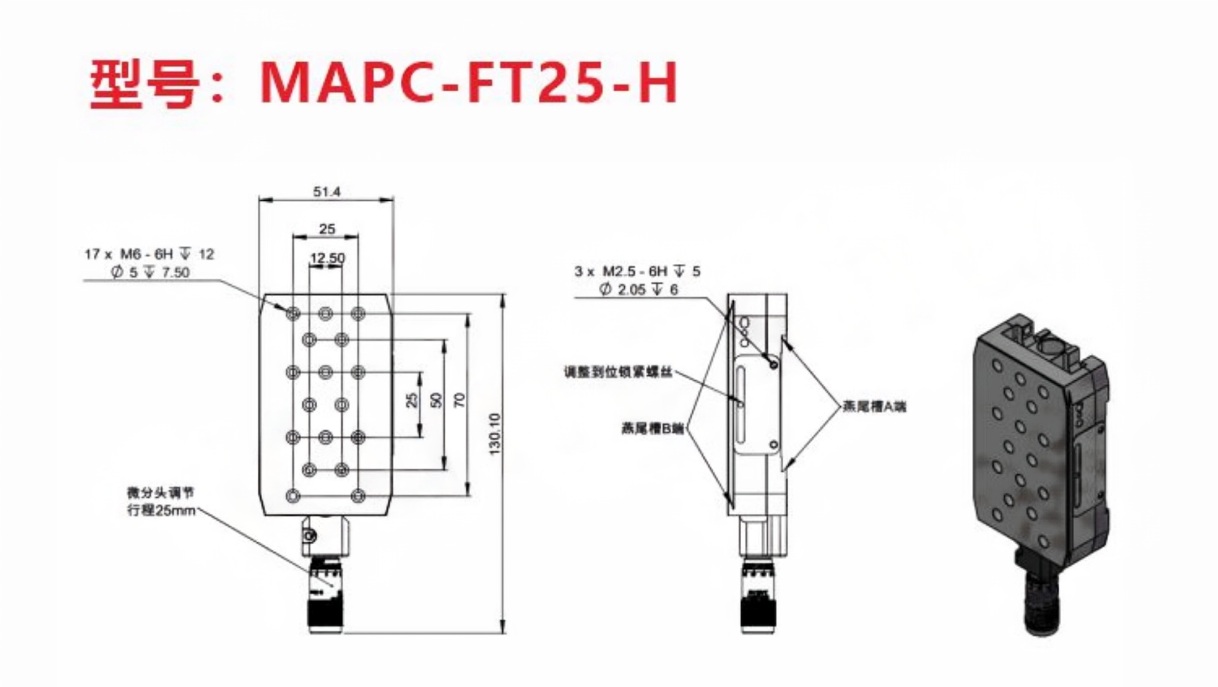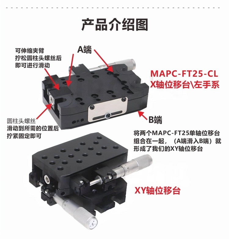 10-测微头固定套件可实现侧装测微头与后装测微头位移台之间的切换MAPC-FT25CG:将后装测微头的位移台改装成侧装测微头的位移台MAPC-FT25HG:将侧装测微头的位移台改装成后装测微头的位移台