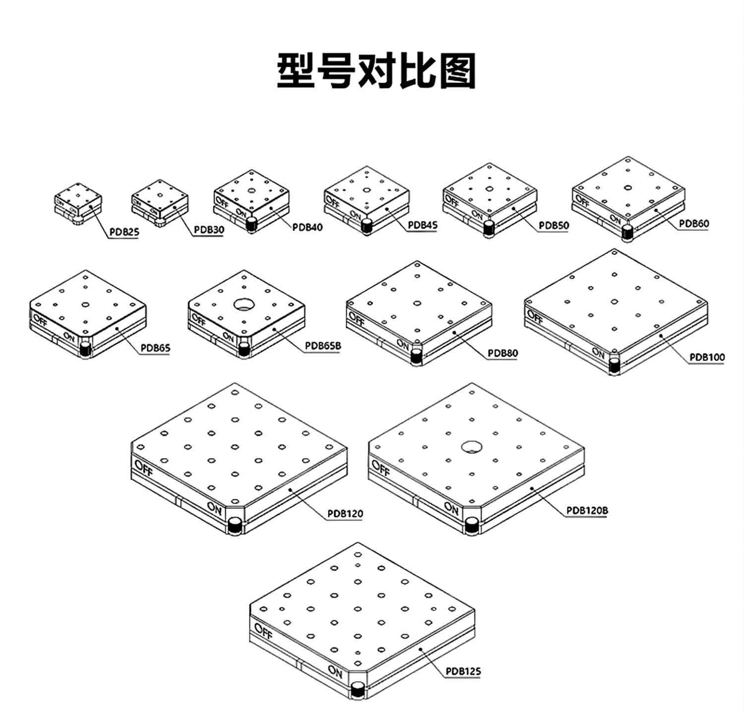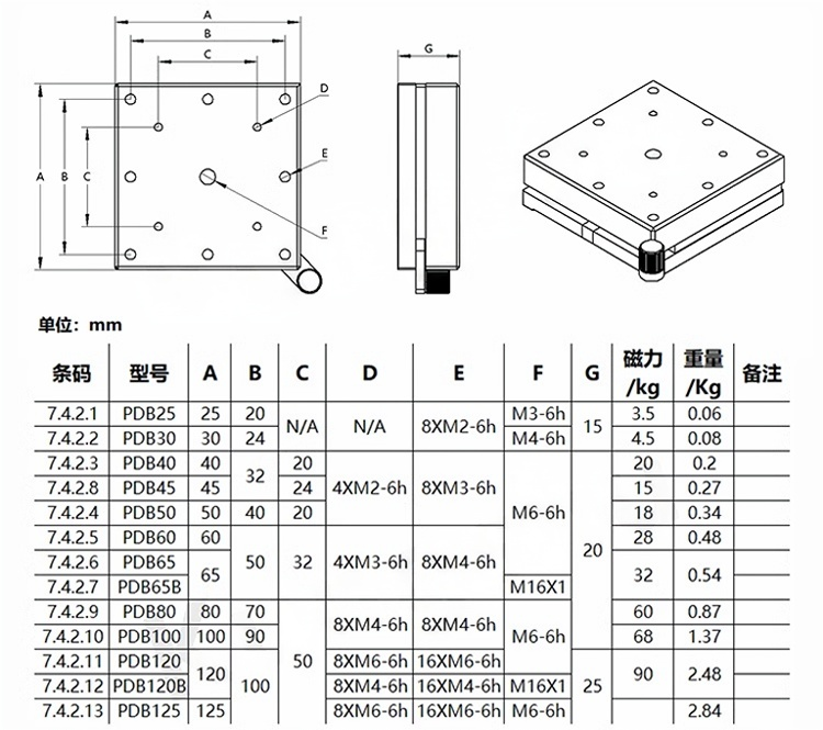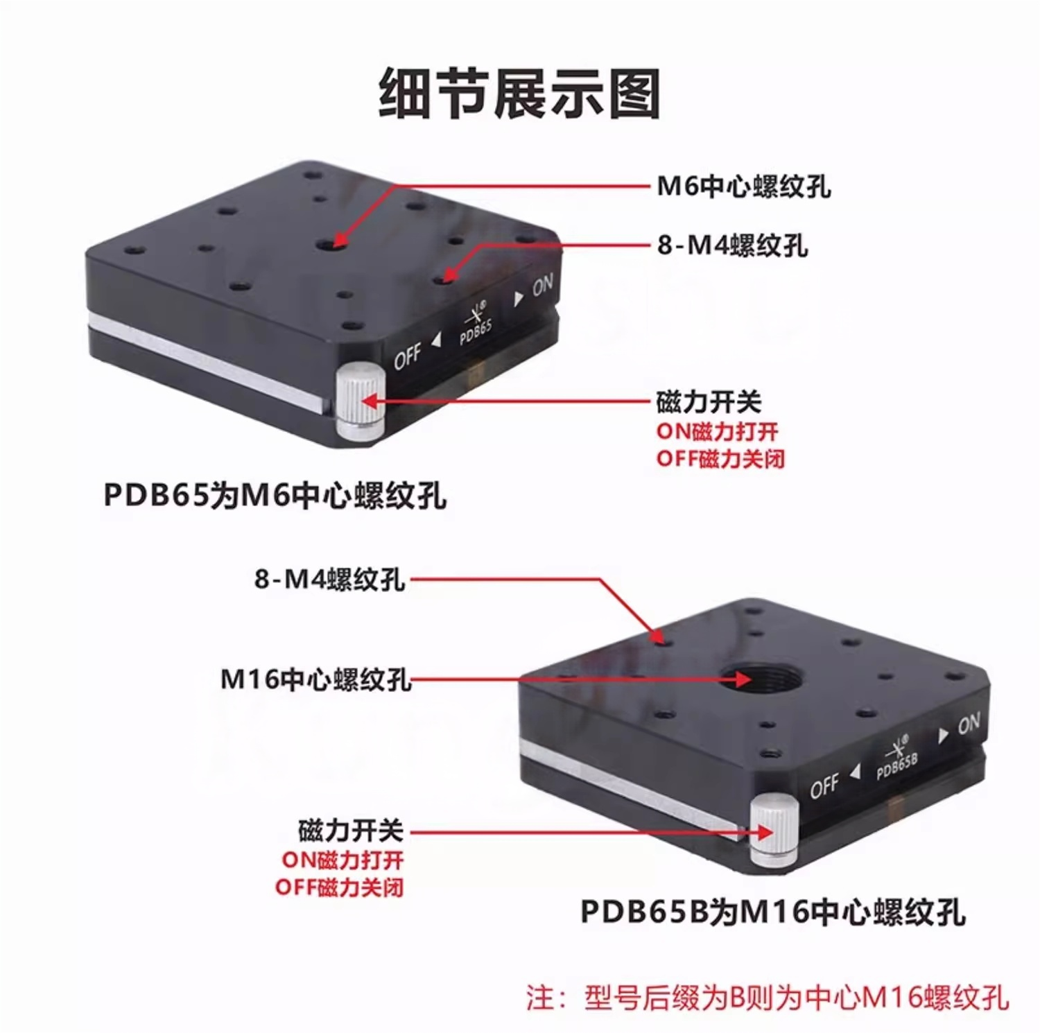 1-合金钢制造表面黑色氧化;2-底座兼容光学接杆和接杆安装座同时也兼容各种标准滑台;3-拨动式磁力开关底座,实现实验过程中的灵活定位;4-多种尺寸可选:25x25mm、30x30mm、40x40mm、45x45mm、50x50mm、60x60mm、65x65mm、80x80mm、100x100mm、120x120mm、125x125mm等;5-支持定制。