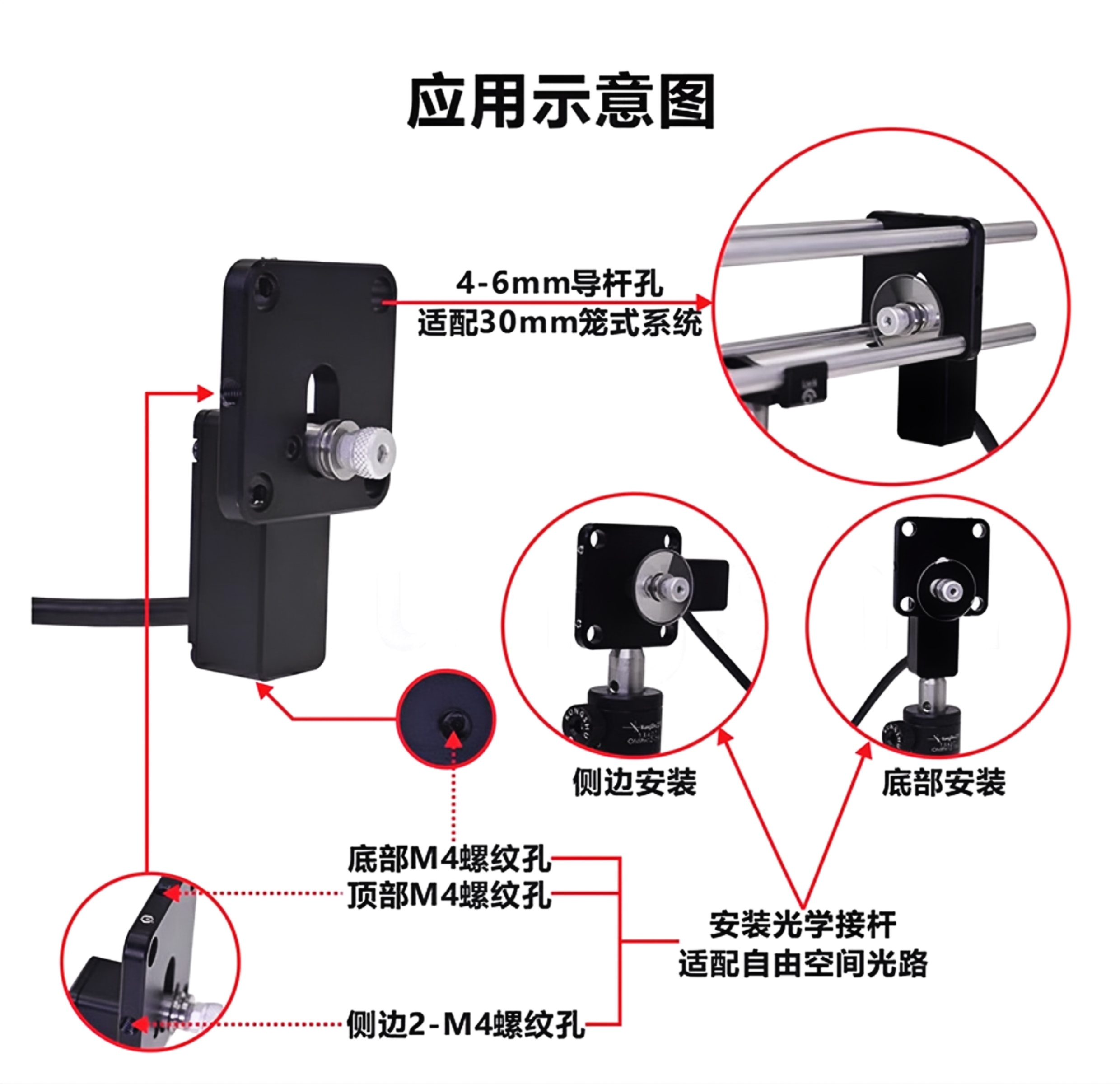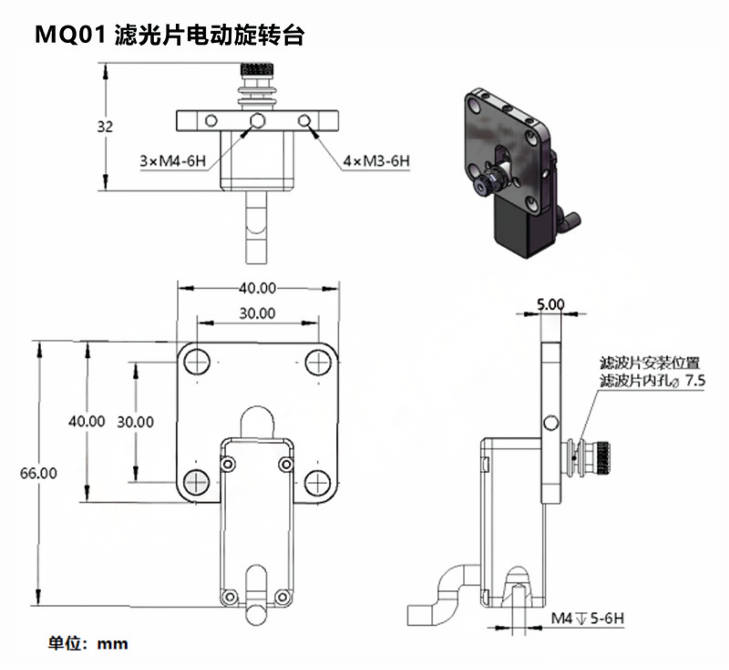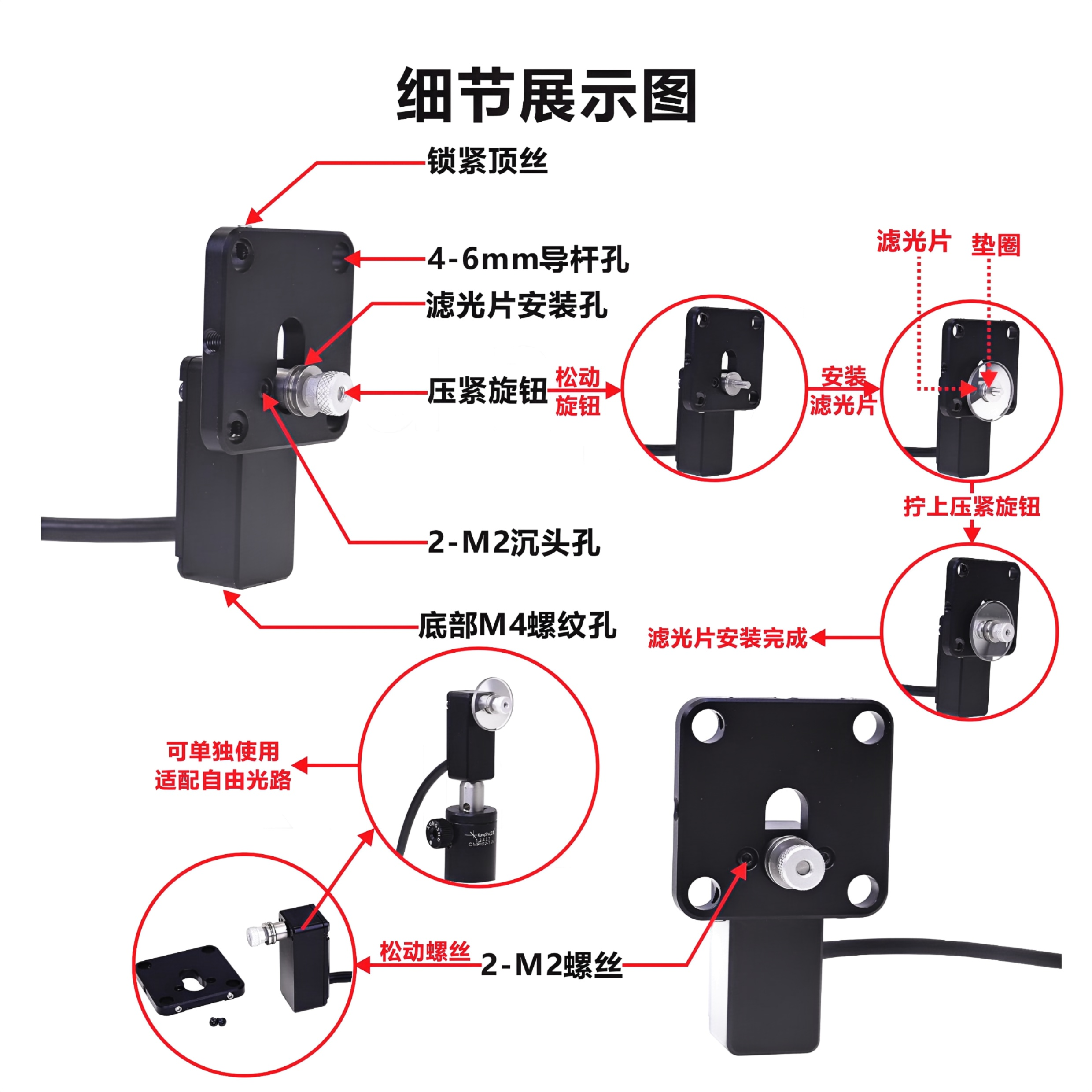 1-铝合金材质表面黑色阳极; 2-旋转台采用10mm的4线2相微型步进电机;3-超小体积,电机长宽均为18mm,适合狭小空间使用: 4-采用全金属减速齿轮设计,大输出扭矩;5-步进控制,可提供准确的角度控制和重复定位: 6-双方向超高分辨率,旋转角分辨率≤0.02度7-用于连续型中性密度滤光片。
