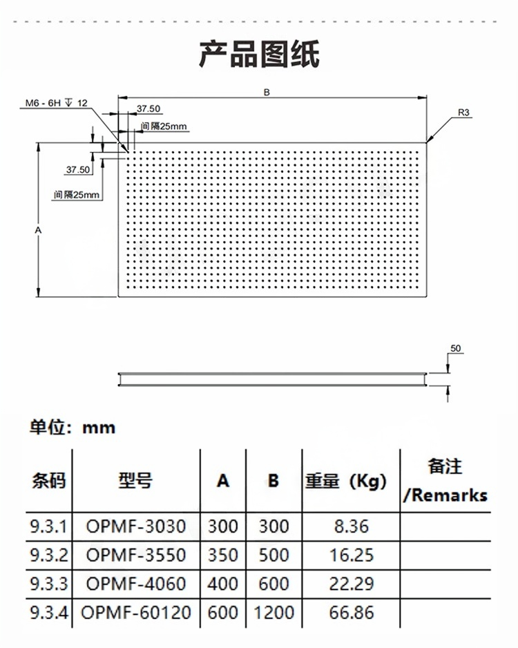 1-上下为不锈钢材料,带有磁性 2-矩阵25x25mm的M6螺纹孔;3-厚度均为50mm; 4-0PMF-4060代表尺寸400x600mm; 5-支持定制。