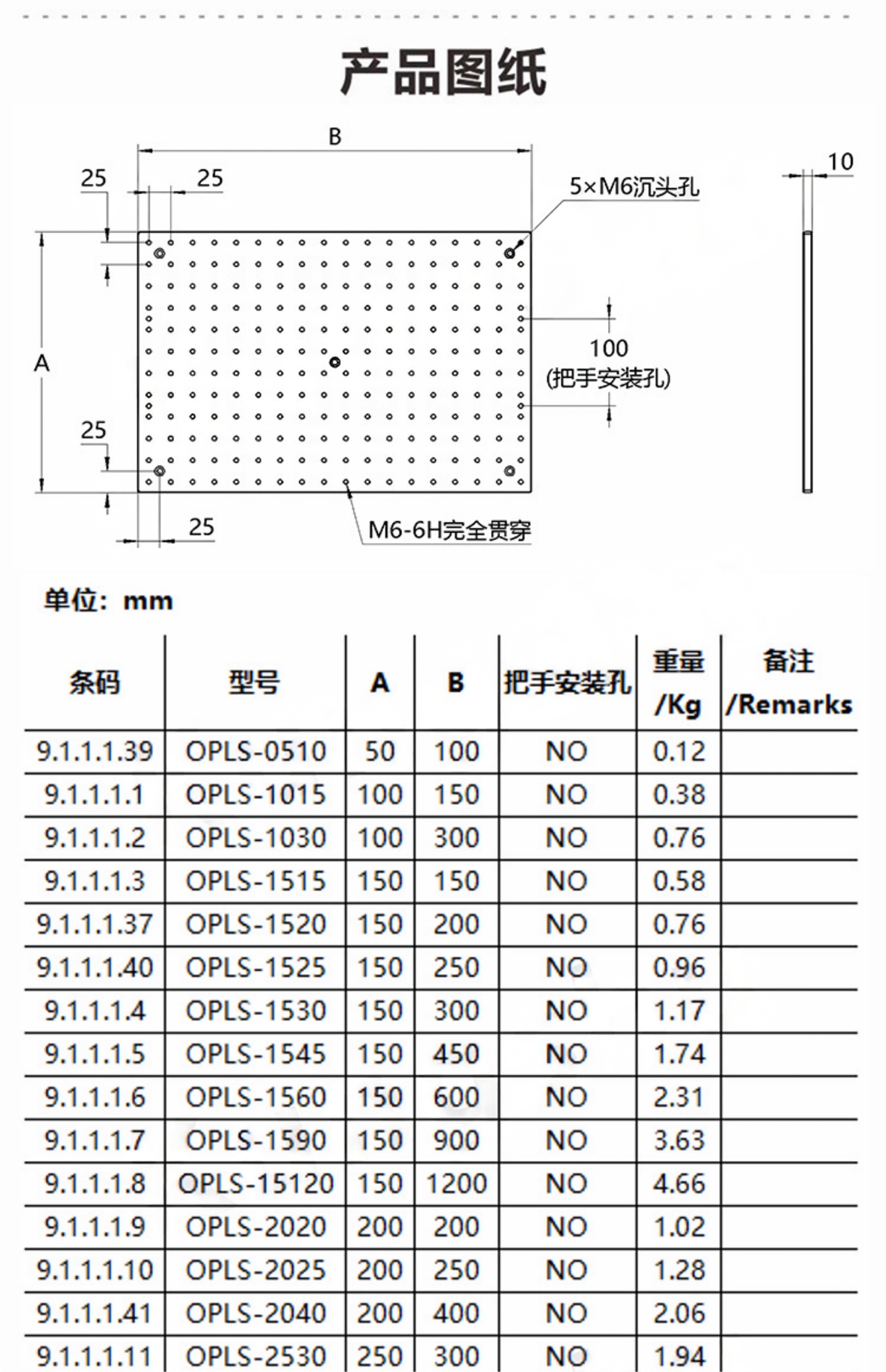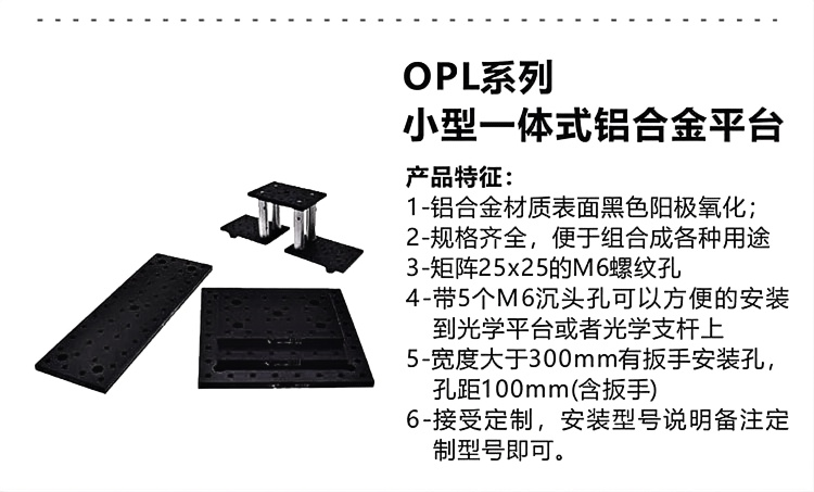 1-铝合金材质表面黑色阳极氧化;2-规格齐全,便于组合成各种用途 3-矩阵25x25的M6螺纹孔 4-带5个M6沉头孔可以方便的安装到光学平台或者光学支杆上 5-宽度大于300mm有扳手安装孔孔距100mm(含扳手)6-接受定制,安装型号说明备注定制型号即可。