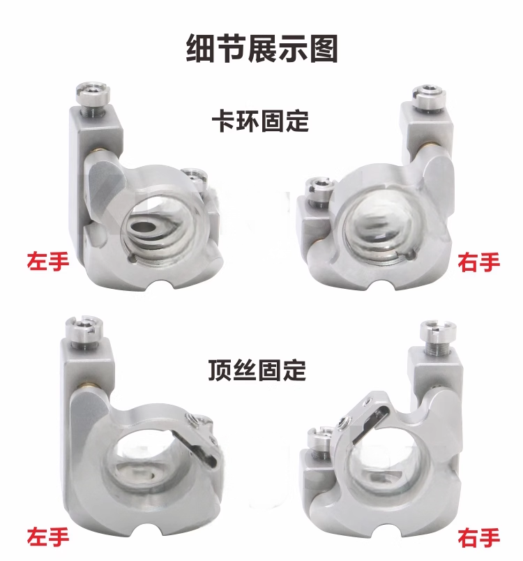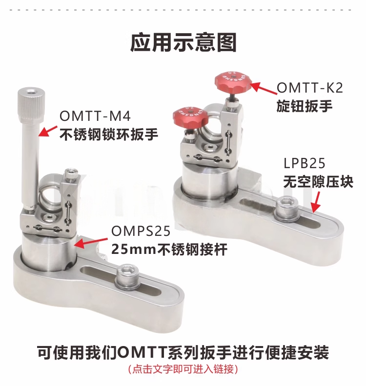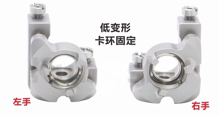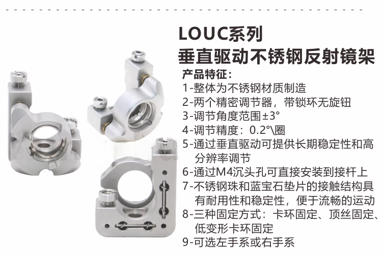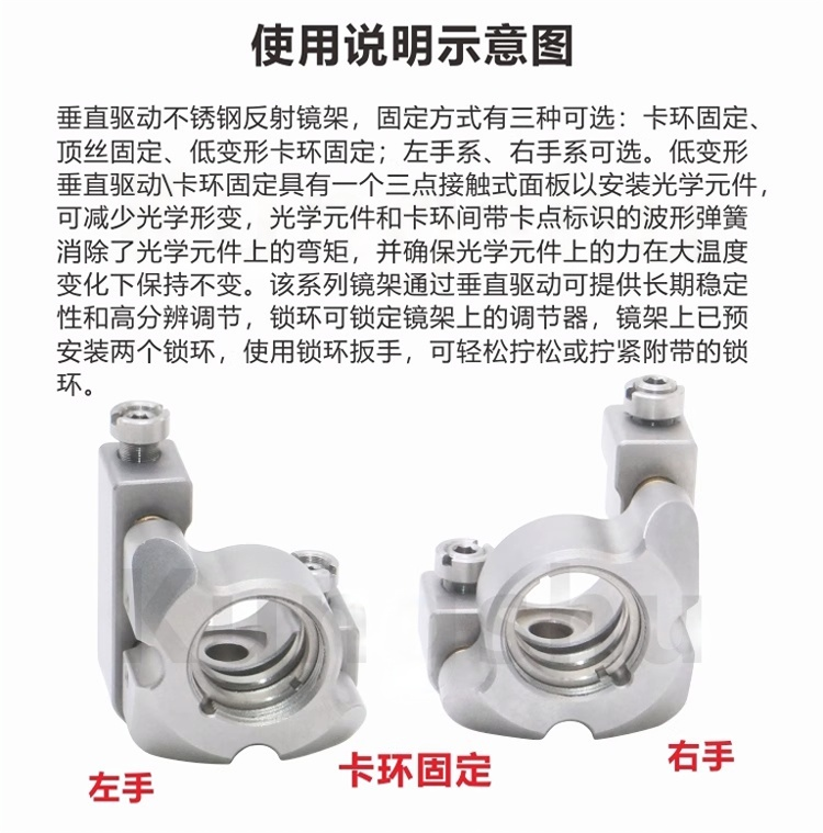 1-整体为不锈钢材质制造 2-两个精密调节器,带锁环无旋钮 3-调节角度范围±3° 4-调节精度:0.2°\圈 5-通过垂直驱动可提供长期稳定性和高分辨率调节 6-通过M4沉头孔可直接安装到接杆上 7-不锈钢珠和蓝宝石垫片的接触结构具有耐用性和稳定性,便于流畅的运动 8-三种固定方式:卡环固定、顶丝固定低变形卡环固定 9-可选左手系或右手系
