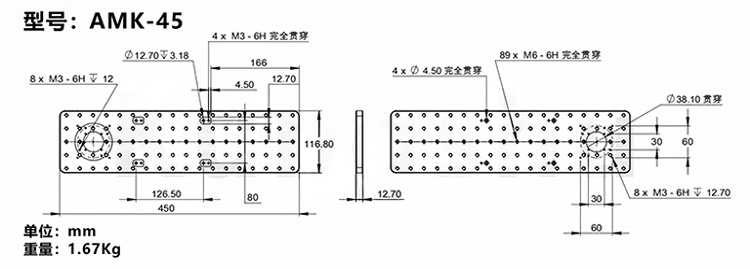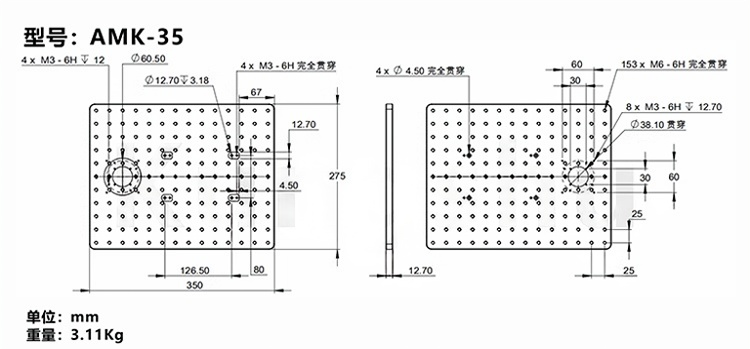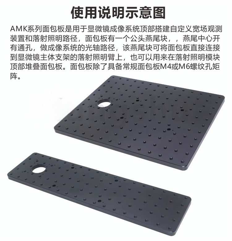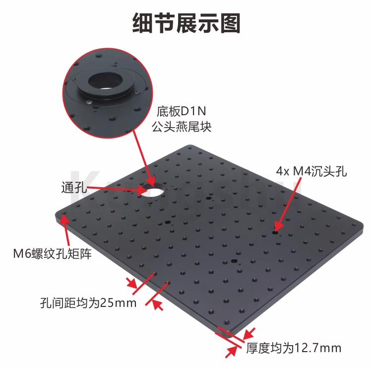 1-整体为铝合金材质制造 2-表面黑色阳极氧化处理 3-标准公制M6螺纹孔矩阵 4-顶部面包板厚度均为12.7mm 5-底部70mm公头燕尾块,用来连接显微镜主体系统 6-面包板通过M6螺纹孔与实验台面或其他光学元件进行固定,安装方便快捷