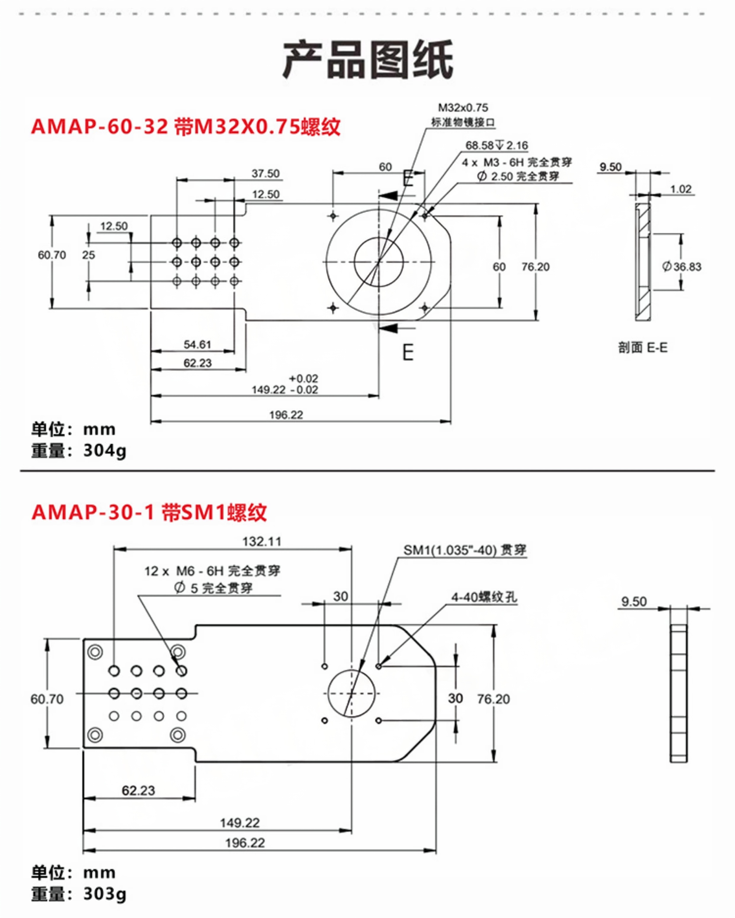 1-在积木显微镜系统中只安装一个物镜; 2-有兼客60mm和30mm笼式组件可选; 3-有带M32X0.75和SM1螺纹安装孔可选; 4-支持定制。
