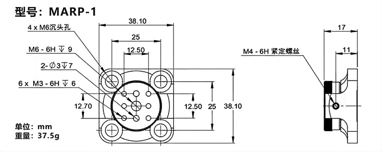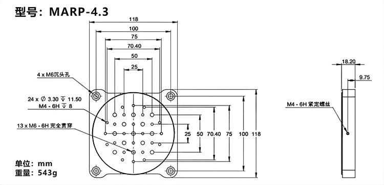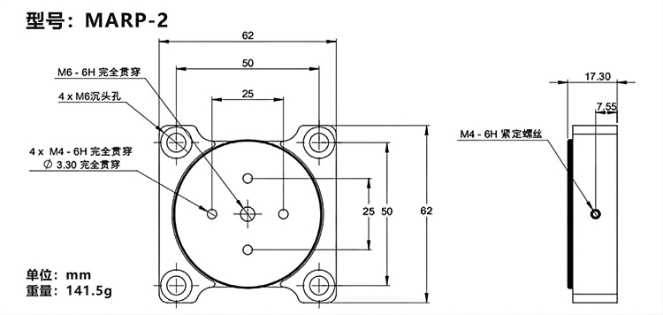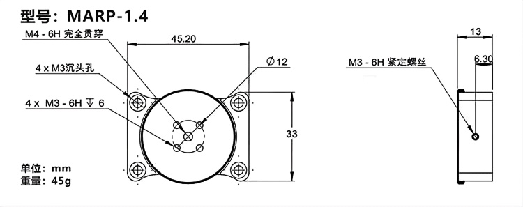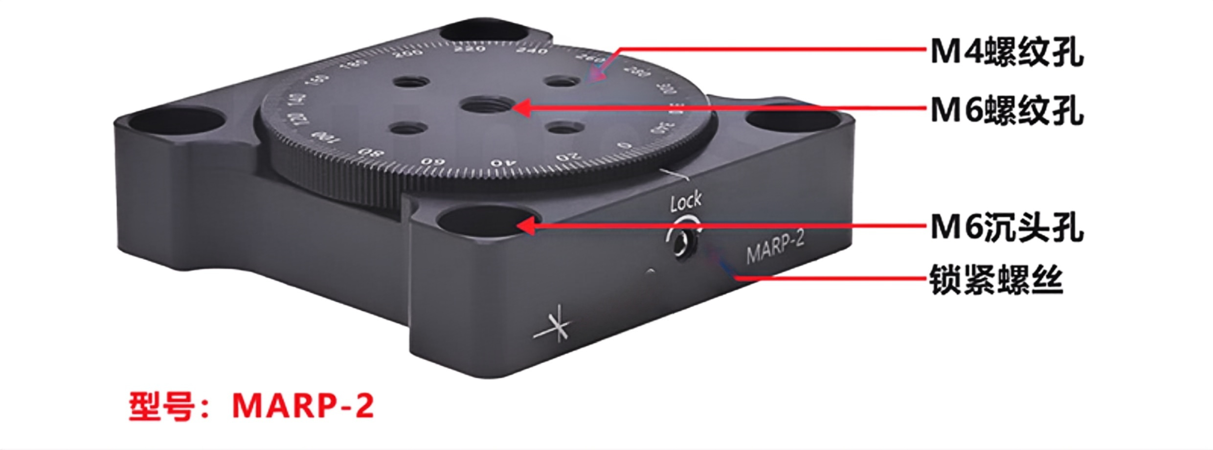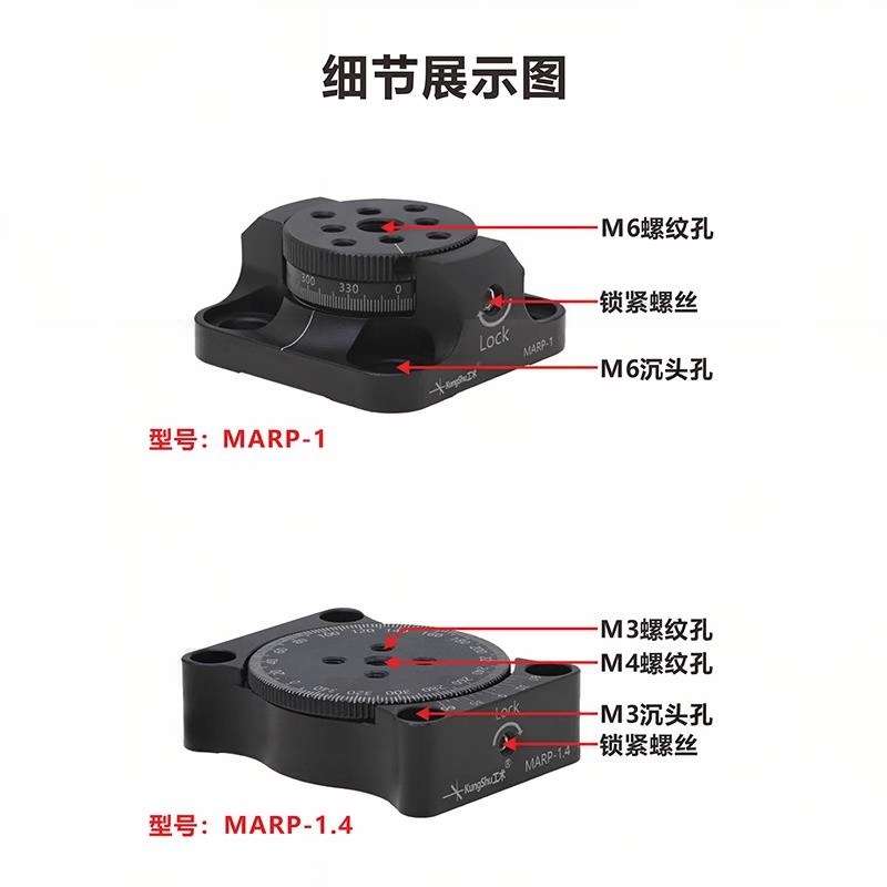 1-铝合金材质表面黑色阳极氧化 2-可连续旋转360°,激光刻度; 3-可通过侧面的固定螺丝锁定 3-多种规格可选,可选1英寸、1.4英寸、2英寸或4.3英寸位移台;4-四个M6或M3沉头孔,用于安装面包板或光学平台上。