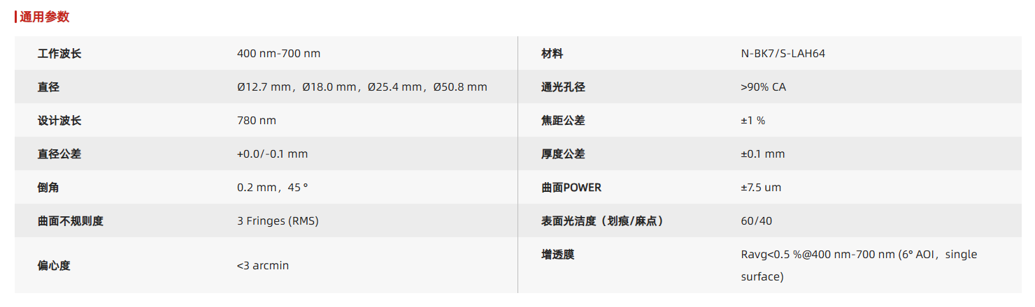未安装的精密抛光非球面透镜,S-LAH64材质,增透膜:400 nm-700 nm,目前有四种尺寸可选:Ø12.7 mm,Ø18.0 mm,Ø25.4 mm,Ø50.8 mm。普通透镜的球面折射无法使平行光汇聚到一点,从而产生球差。而非球面透镜的曲率从中心到边缘连续发生变化,通过调整圆锥常数和非球面系数,能够最大限度地消除球差,使光线汇聚到一点,从而提高光学性能。