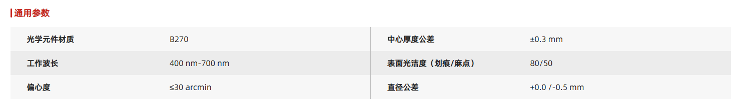 用B270玻璃制作多种非球面聚光透镜,B270玻璃是Schott开发的一种高品质玻璃,具有很高的表面平整度和良好的光学性能,在可见光波段具有良好的透过率。非球面聚光透镜预安装标准透镜套筒。套筒表面均刻有产品型号、类型、直径、焦距和数值孔径,方便用户快速识别透镜参数。