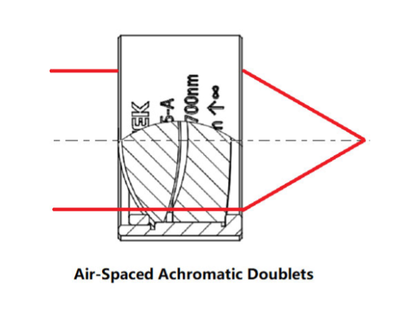 空气隙消色差双合透镜设计时矫正了球差和色差,使其有着接近衍射极限的光斑尺寸,近红外空气隙消色差双合透镜镀有650-1050 nm增透膜,因其比双胶合透镜多两个自由度,所以在有些情况下性能超过了双胶合透镜,每个透镜安装座上都刻有产品的型号、增透膜波长、焦距和准直光的传播方向。