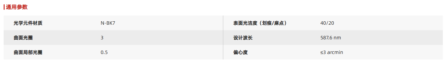 平凸透镜具有正焦距,常用于成像或光束准直等应用。平凸透镜是使用符合RoHS标准的N-BK7玻璃生产,N-BK7是最常用于高质量光学元件的材料,多用于可见光和近红外应用领域。所有圆形透镜都预安装标准透镜套筒或者透镜安装转接件。这些机械件表面均刻有产品型号、类型、直径和焦距,方便用户快速识别透镜参数。