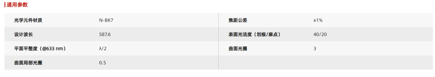 平凹透镜具有负焦距常用于成像或光束准直等应用。平凹透镜是使用符合RoHS标准的N-BK7玻璃生产,N-BK7是最常用于高质量光学元件的材料,多用于可见光和近红外应用领域。所有圆形透镜都预安装标准透镜套筒或者透镜安装转接件。这些机械件表面均刻有产品型号、类型、直径和焦距,方便用户快速识别透镜参数。