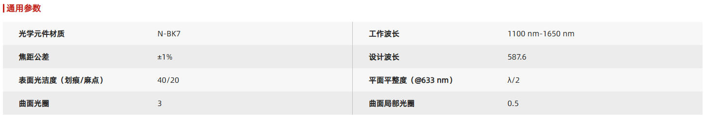 平凹透镜具有负焦距常用于成像或光束准直等应用。平凹透镜是使用符合RoHS标准的N-BK7玻璃生产,N-BK7是最常用于高质量光学元件的材料,多用于可见光和近红外应用领域。所有圆形透镜都预安装标准透镜套筒或者透镜安装转接件。这些机械件表面均刻有产品型号、类型、直径和焦距,方便用户快速识别透镜参数。