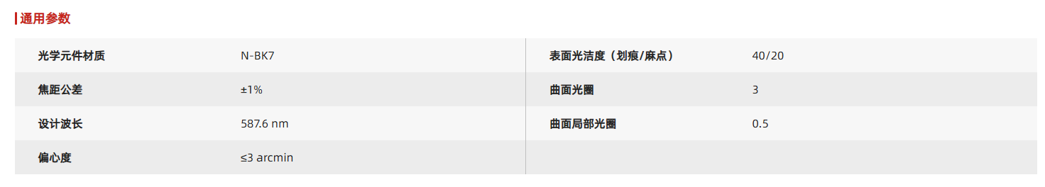 双凸透镜具有正焦距常用于成像或光束准直等应用。采用N-BK7玻璃生产双凸透镜,N-BK7是最常用于高质量光学元件的材料,多用于可见光和近红外应用领域。所有圆形透镜都预安装标准透镜套筒或者透镜安装转接件。这些机械件表面均刻有产品型号、类型、直径和焦距,方便用户快速识别透镜参数。