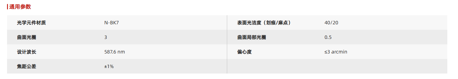 双凸透镜具有正焦距常用于成像或光束准直等应用。采用N-BK7玻璃生产双凸透镜,N-BK7是最常用于高质量光学元件的材料,多用于可见光和近红外应用领域。 所有圆形透镜都预安装标准透镜套筒或者透镜安装转接件。这些机械件表面均刻有产品型号、类型、直径和焦距,方便用户快速识别透镜参数。