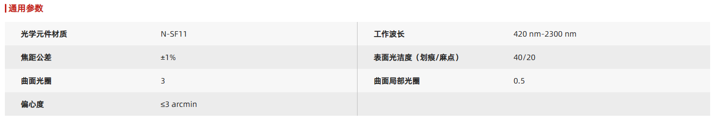 双凹透镜具有负焦距常用于成像或光束准直等应用。因为N-SF11具有较低的阿贝数,因此选择使用经RoHS认证的N-SF11制作多种焦距更小的透镜,并且N-SF11透镜更加适用于特别严苛(酸性或碱性)的环境。所有圆形透镜都预安装标准透镜套筒或者透镜安装转接件。这些机械件表面