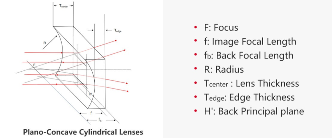 不同于球面透镜,柱透镜只在一个方向上对光束起作用,平凹柱面透镜非常适合用于一维放大应用。典型应用包括双柱透镜组准直和圆化激光二极管输出光束。为了减少球差,平凹柱面透镜用于将准直光束发散成光斑时,光束应入射到透镜曲面上;准直线光源时,光束应入射到透镜平面上。