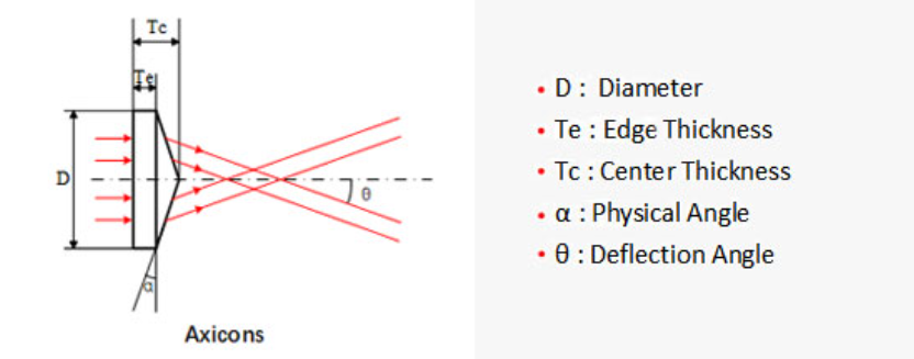 提供的锥透镜的基片材料为紫外熔融石英,由一个圆锥面和一个平面组成,可将入射准直光束变为环形光束。我们有2°、5°四种不同夹角(α)的锥透镜可选,每款透镜的边缘画有箭头,箭头指向锥面。并且表面镀有700 nm-1100 nm增透膜,减少表面的反射,增加透过率。
