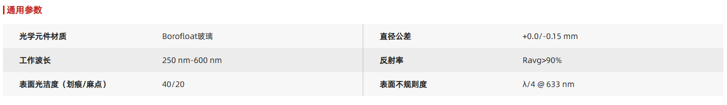 紫外增强铝膜凹面反射镜在250 nm-600 nm波长范围内具有较高的反射率(Ravg>90%),非常适用于紫外波段光束的准直、汇聚和成像,且不带来色差。该反射镜包含两种尺寸(Ø12.7 mm & Ø25.4 mm)和七种不同焦距(-25 mm~-500 mm),可根据尺寸搭配不同的反射镜架使用。尽管金属膜凹面反射镜表面镀有保护膜,仍建议在湿度小、室温环境下使用和保存。使用反射镜时,请配戴乳胶手套或手指套等防护产品,防止手指上残留的油脂和其他残留物污染光学元件表面。