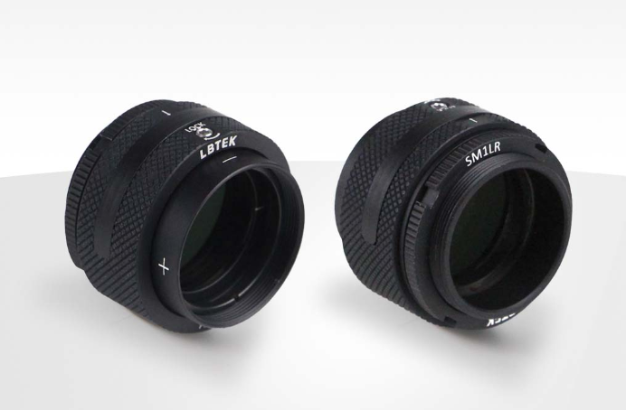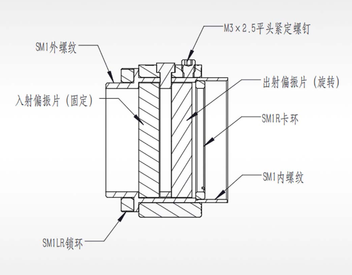 可调偏振镜入射和出射端分别有SM1外螺纹和内螺纹,可通过螺纹连接其他光学元件或组件。将可调偏振镜拧入SM1内螺纹组件时,使用PCW-A扳手(单独出售)拧紧SM1LR带槽锁定环来固定可调偏振镜,可使入射偏振片的透射轴与输入光源的偏振方向平齐。滚花环上箭头对准(+)时,两片偏振片的透射轴与入射光偏振方向平行,此时透过率最大;滚花环上箭头对准(-)时,入射偏振片透射轴与入射光偏振方向平行,出射偏振片透射轴与入射偏振片透射轴垂直时,透过率最小。滚花转环可以转动超过标记(+)和标记(-)15°,以满足最大透过率到最小透过率的调节需求。转动出射偏振片,可连续调节出射光强度;使用M1.5六角扳手拧紧M3×2.5平头紧定螺钉,可锁紧出射偏振片,固定透过率大小。可调偏振镜适用于低功耗的应用场景,当用于产生线偏振光时,具有较高的消光比和±20 °的大入射角范围的特点。